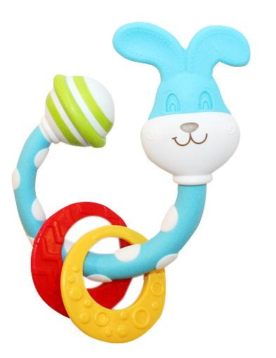 На хвосте веселого зайчонка удобно разместилась бело-салатовая погремушка, издающая дребезжащий звук перекатывающимися в середине шариками.