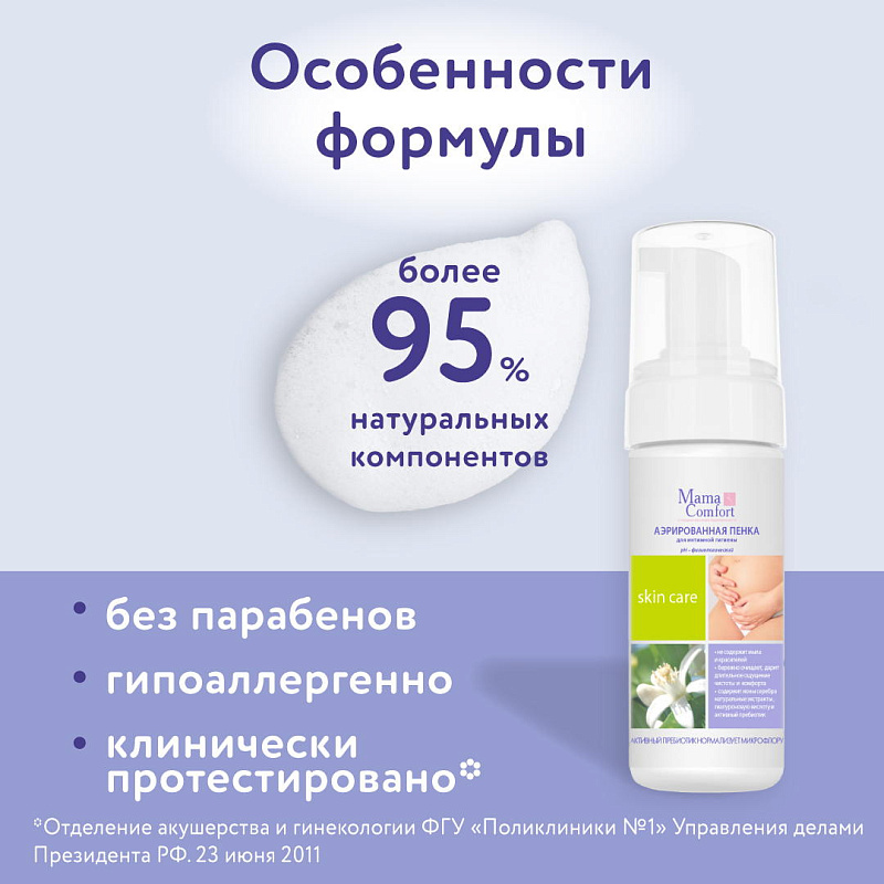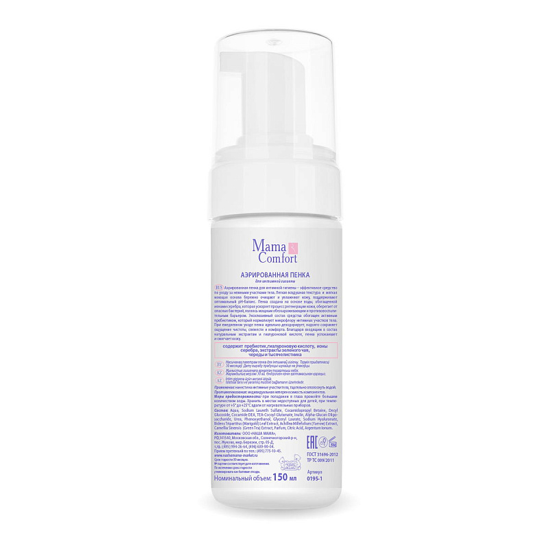 Аэрированная пенка для интимной гигиены серии "Mama Com.fort" является эффективным средством по уходу за нежными участками тела. Легкая воздушная текстура и мягкая моющая основа бережно очищает и увлажняет кожу, поддерживая оптимальный рН-баланс. Пенка создана на основе воды, обогащенной ионами серебра, которая ускоряет процесс регенерации кожи, оберегает от опасных бактерий, являясь моющим обеззараживающим и противовоспалительным барьером. Эксклюзивный состав пенки обогащен активным пребиотиком, который нормализует микрофлору интимных участков тела. При ежедневном уходе пенка идеально дезодорирует, надолго сохраняет ощущение чистоты, свежести и комфорта, а благодаря входящим в состав натуральным экстрактам и гиалуроновой кислоте, пенка успокаивает и смягчает кожу. Пенка гипоаллергенна. В состав пенки входят активные компоненты: пребиотик, гиалуроновая кислота, ионы серебра, экстракты зеленого чая, череды и тысячелистника.