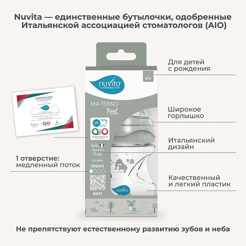 - Единственная бутылочка, одобренная Итальянской ассоциацией стоматологов (AIO), не препятствует естественному развитию зубов и неба.
