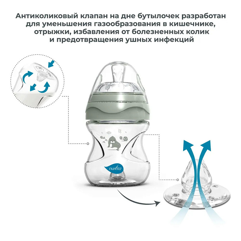 - Оснащена уникальной антиколиковой системой, встроенной в дно бутылочки: воздух, поступающий из нижней части бутылочки, никогда не смешивается с молоком и не попадает к малышу.