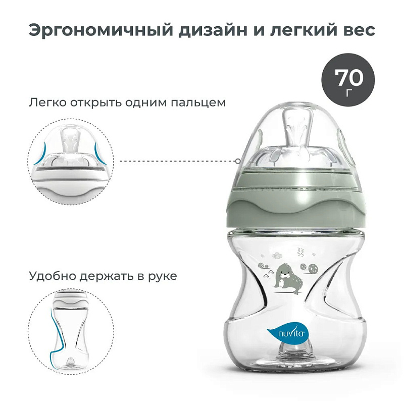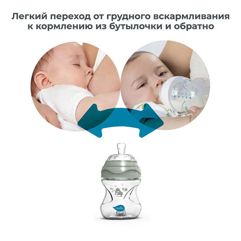 Nuvita Materno Feel - инновационная антиколиковая пластиковая бутылочка, которая облегчает чередование кормления грудью и из бутылочки, не нарушая привычку ребенка к естественному кормлению.
