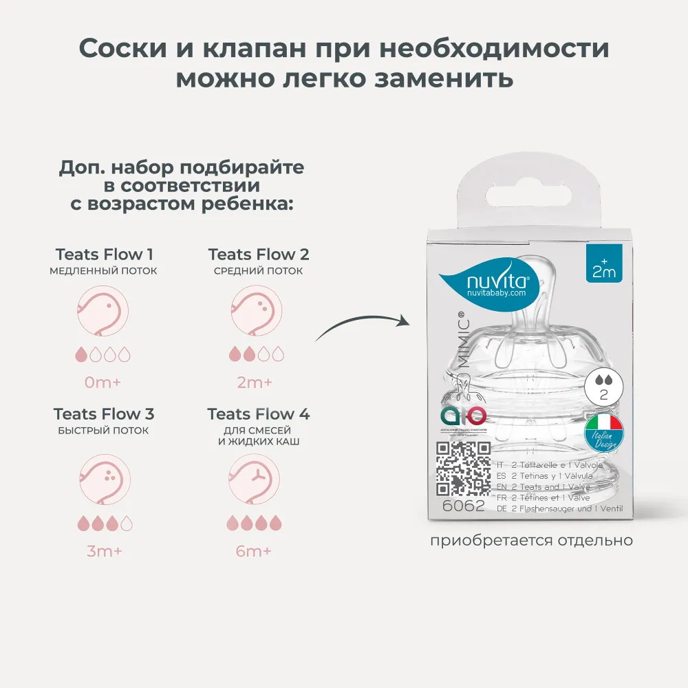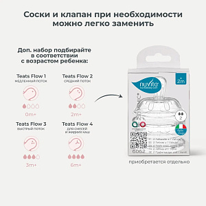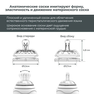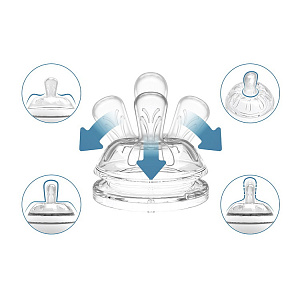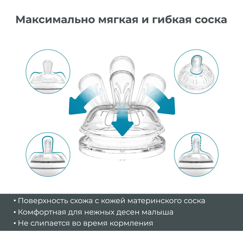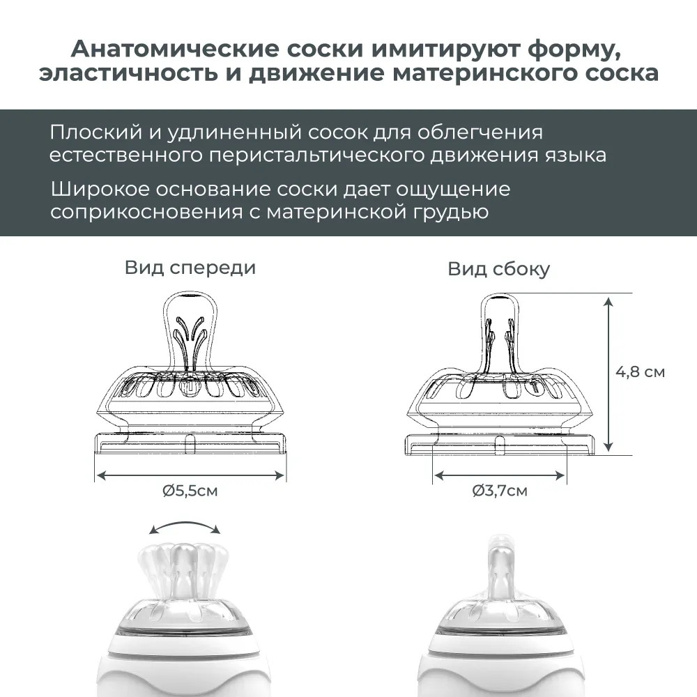 - Полое основание соски имитирует естественную эластичность материнского соска во время грудного вскармливания.