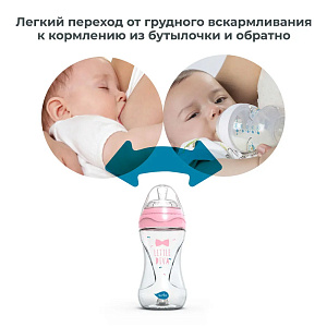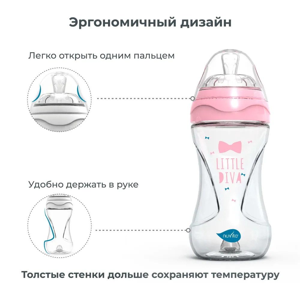 - Оснащена уникальной антиколиковой системой, встроенной в дно бутылочки: воздух, поступающий из нижней части бутылочки, никогда не смешивается с молоком и не попадает к малышу.