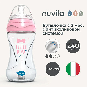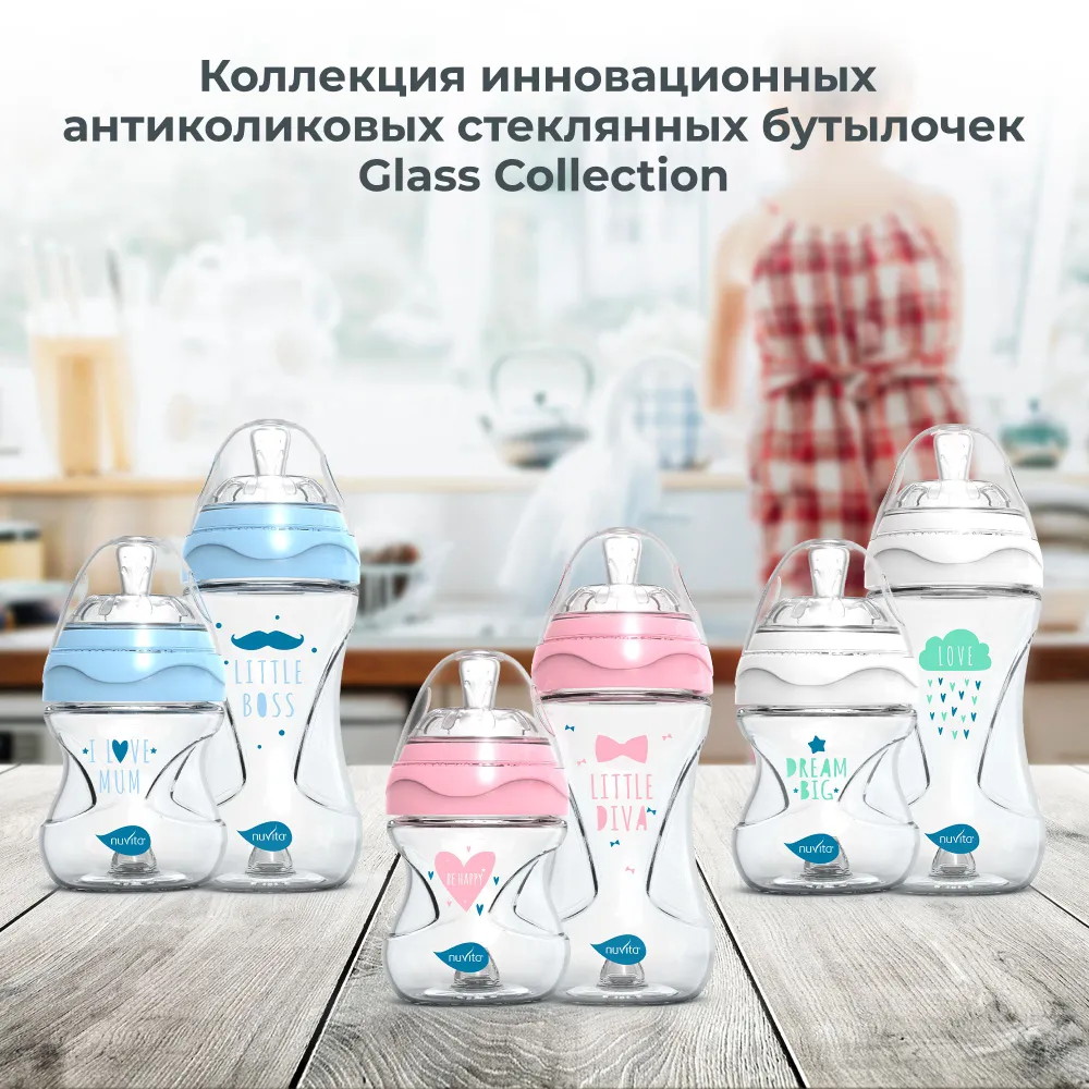 Инновационная антиколиковая стеклянная бутылочка Nuvita 6033 Glass Collection облегчает чередование кормления грудью и из бутылочки, не нарушая привычку ребенка к естественному кормлению.
