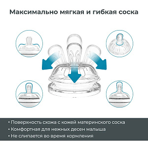 - Соска имитирует форму, эластичность и движение материнского соска.