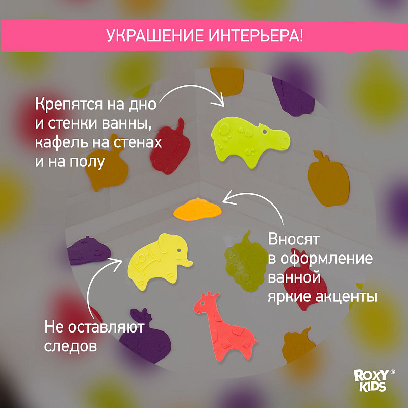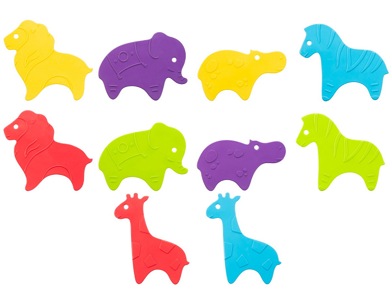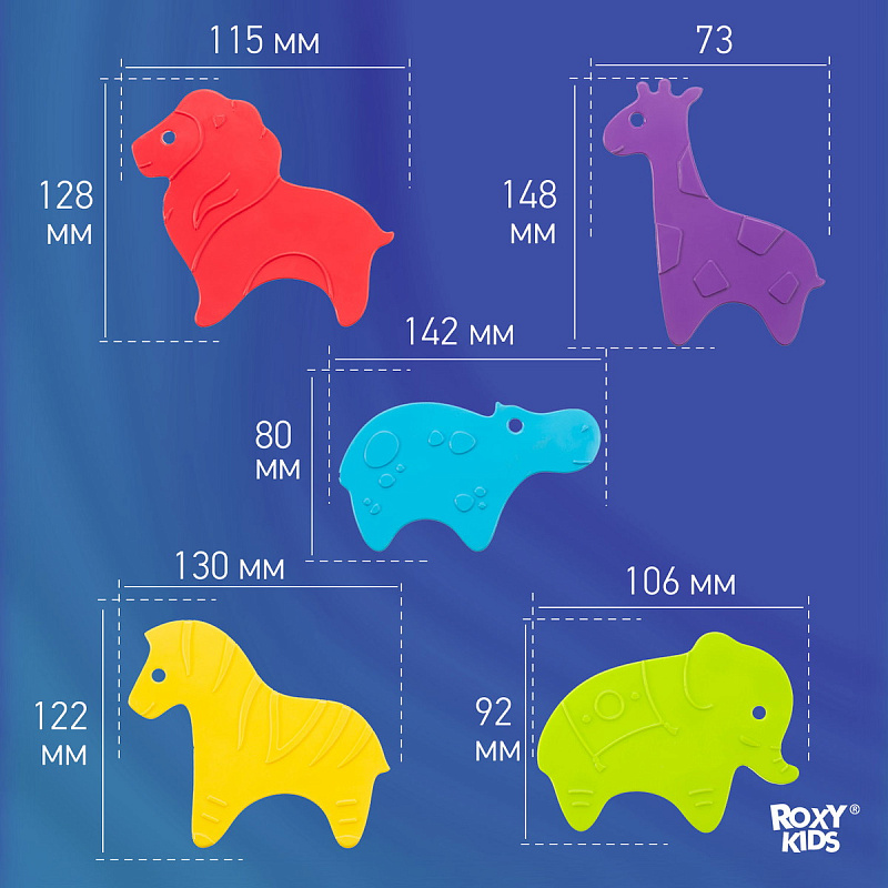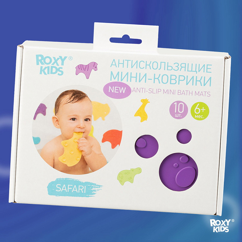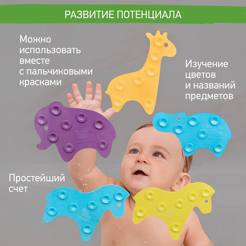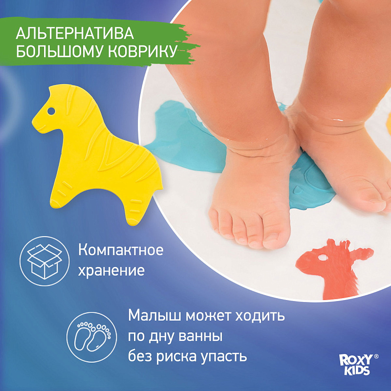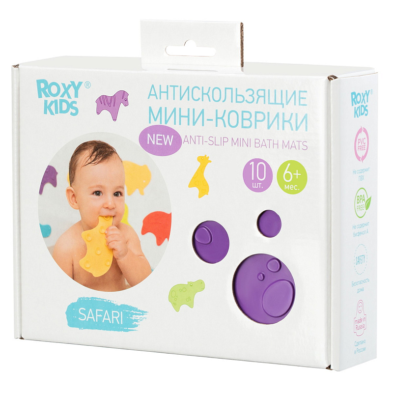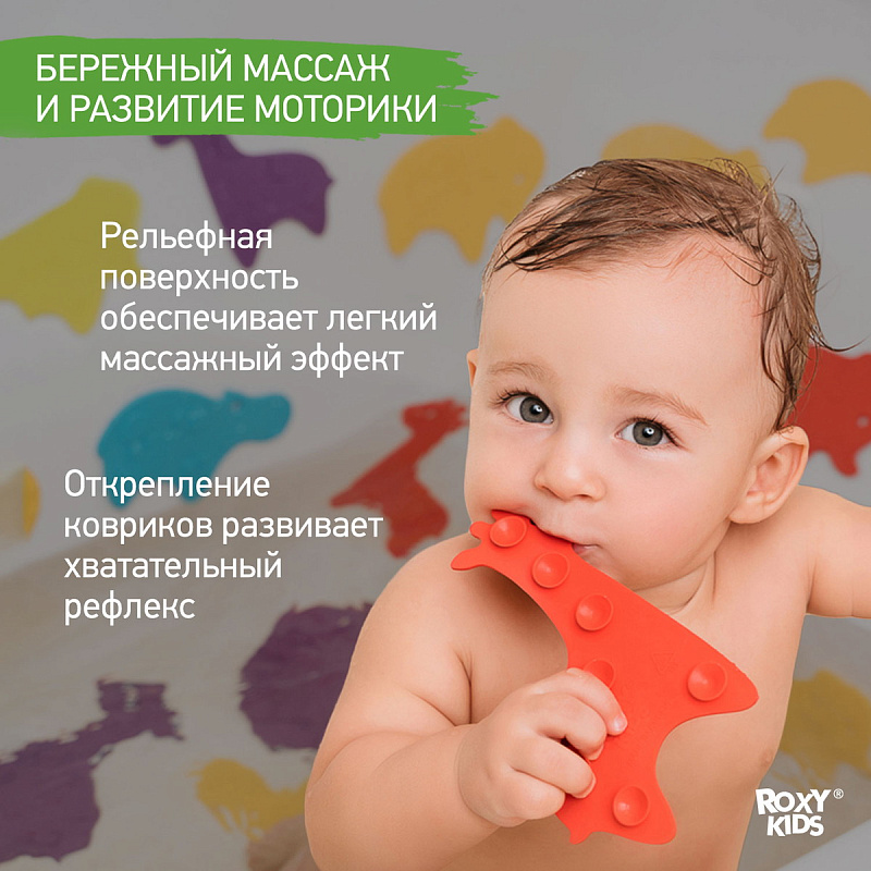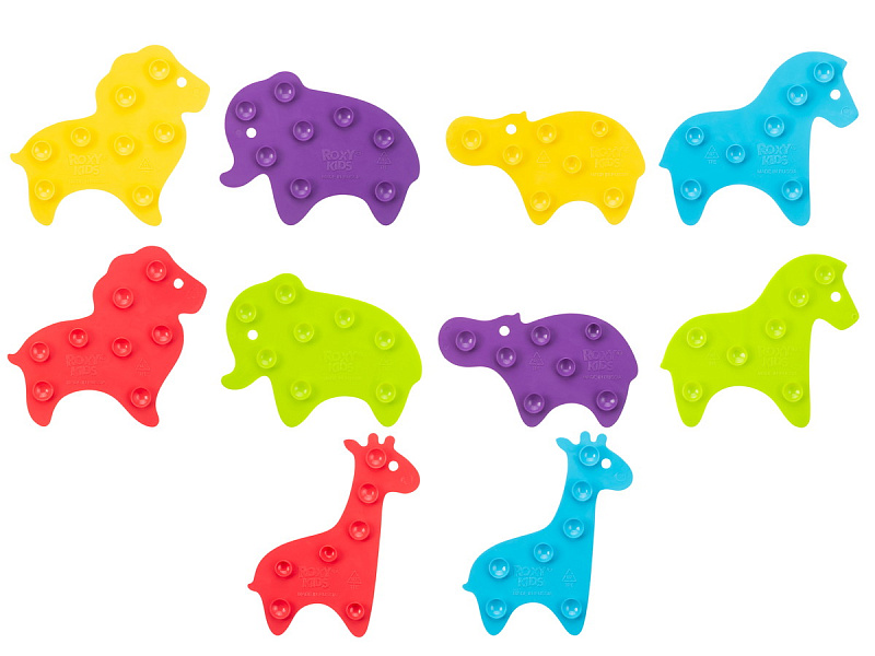 Мини коврики для ванной ANIMALS от ROXY-KIDS произведены в России из современного и безопасного материала ТЭП. Этим коврикам можно найти множество применений. Мини-коврики станут отличной заменой большому коврику, который неудобно промывать и сушить. Также их используют как массажеры, потому что рельефная поверхность обеспечивает бережный массаж стоп и ладоней. Ребенок может грызть их, потому что они изготовлены из специального безопасного материала. Ими можно также украсить интерьер, налепив коврики на дно и стенки ванны или кафель, чтобы не только обеспечить удобство, но и расставить яркие цветовые акценты. Кроме того, эти мини-коврики абсолютно не пахнут, потому что не содержат ПВХ. Для ухода их достаточно просто периодически промывать с мылом, полоскать и хорошо сушить. Они легко и надежно крепятся с помощью присосок на любую гладкую поверхность, при этом не оставляют следов. В ассортименте есть несколько наборов ковриков.