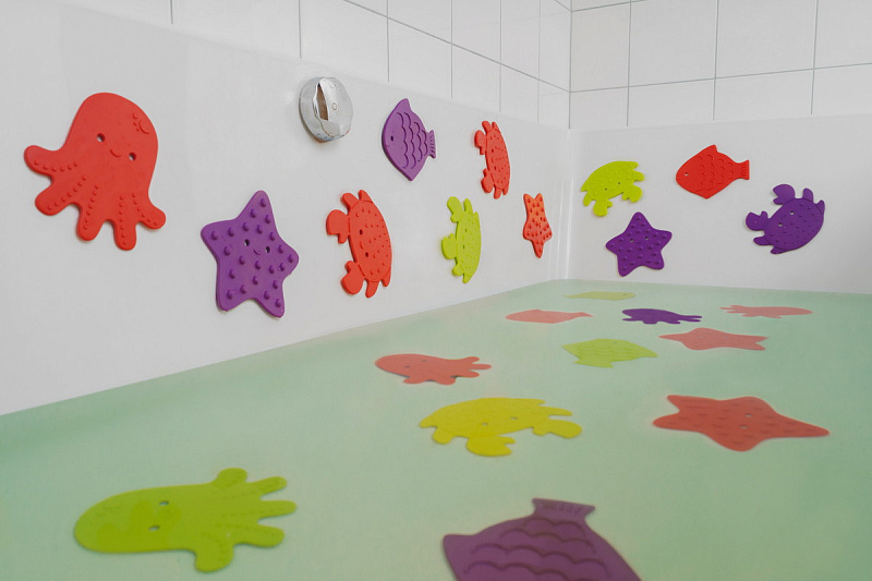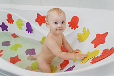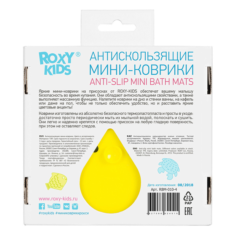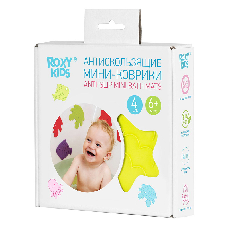 Мини коврики для ванной от ROXY-KIDS произведены в России из современного и безопасного материала ТЭП. Этим коврикам можно найти множество применений. Мини-коврики станут отличной заменой большому коврику, который неудобно промывать и сушить. Также их используют как массажеры, потому что рельефная поверхность обеспечивает бережный массаж стоп и ладоней. Ребенок может грызть их, потому что они изготовлены из специального безопасного материала. Ими можно также украсить интерьер, налепив коврики на дно и стенки ванны или кафель, чтобы не только обеспечить удобство, но и расставить яркие цветовые акценты. Кроме того, эти мини-коврики абсолютно не пахнут, потому что не содержат ПВХ. Для ухода их достаточно просто периодически промывать с мылом, полоскать и хорошо сушить. Они легко и надежно крепятся с помощью присосок на любую гладкую поверхность, при этом не оставляют следов. В ассортименте есть несколько наборов ковриков.