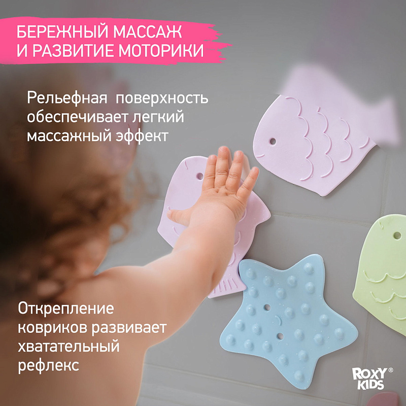 Мини коврики для ванной от ROXY-KIDS произведены в России из современного и безопасного материала ТЭП. Этим коврикам можно найти множество применений. Мини-коврики станут отличной заменой большому коврику, который неудобно промывать и сушить. Также их используют как массажеры, потому что рельефная поверхность обеспечивает бережный массаж стоп и ладоней. Ребенок может грызть их, потому что они изготовлены из специального безопасного материала. Ими можно также украсить интерьер, налепив коврики на дно и стенки ванны или кафель, чтобы не только обеспечить удобство, но и расставить яркие цветовые акценты. Кроме того, эти мини-коврики абсолютно не пахнут, потому что не содержат ПВХ. Для ухода их достаточно просто периодически промывать с мылом, полоскать и хорошо сушить. Они легко и надежно крепятся с помощью присосок на любую гладкую поверхность, при этом не оставляют следов. В ассортименте есть несколько наборов ковриков.