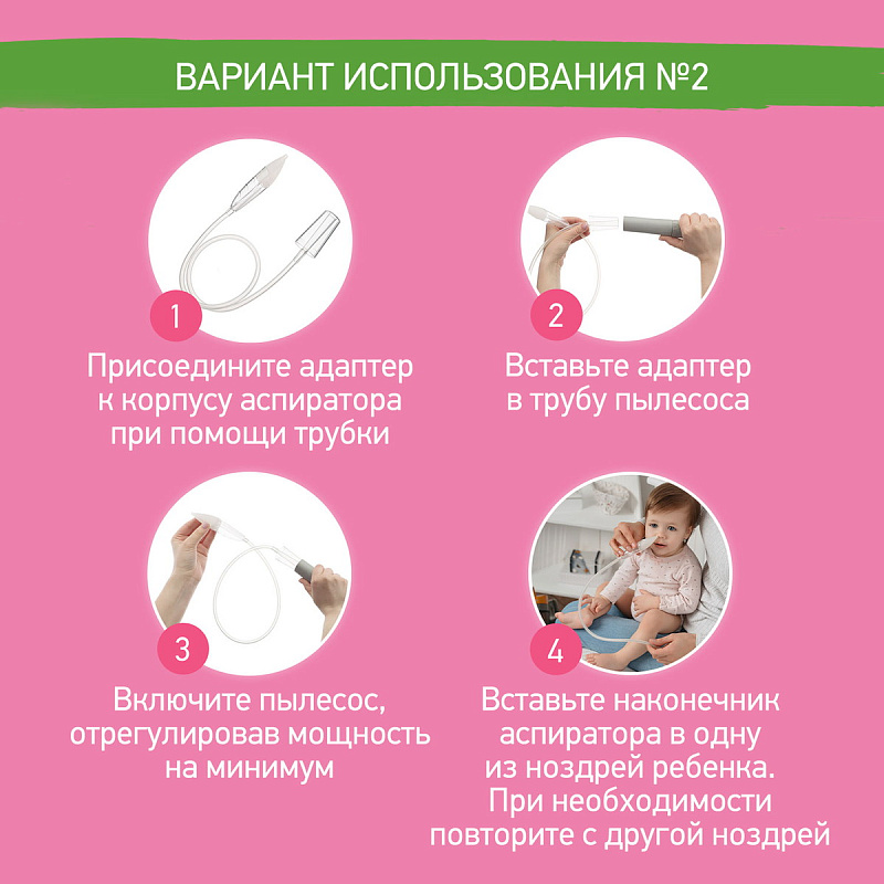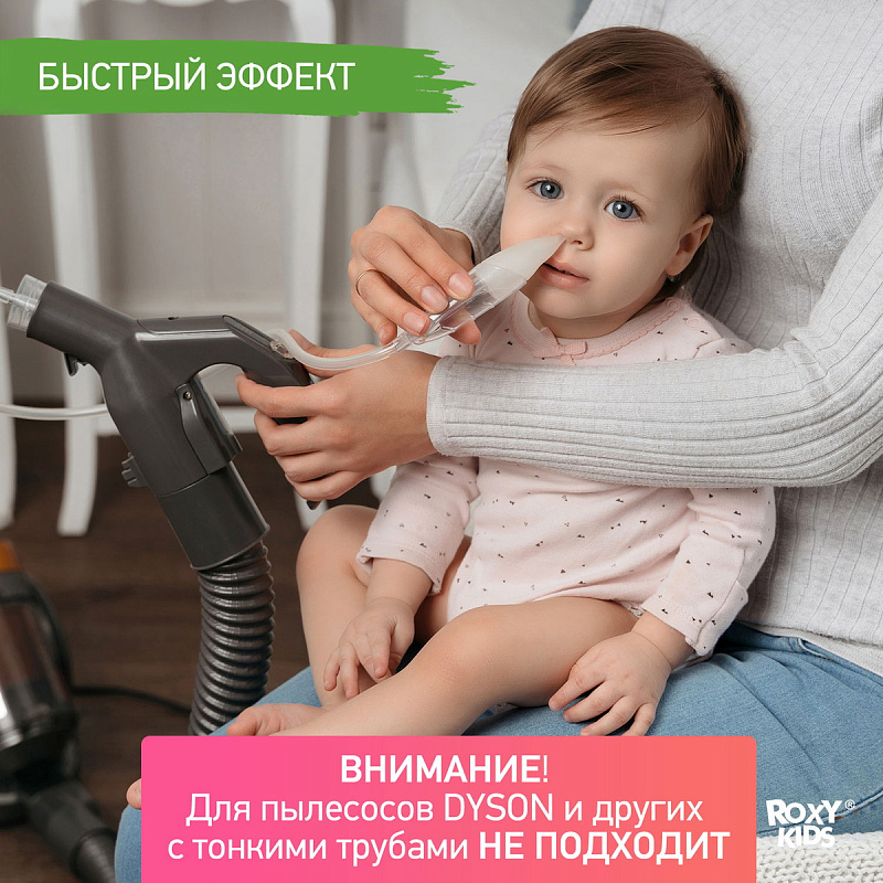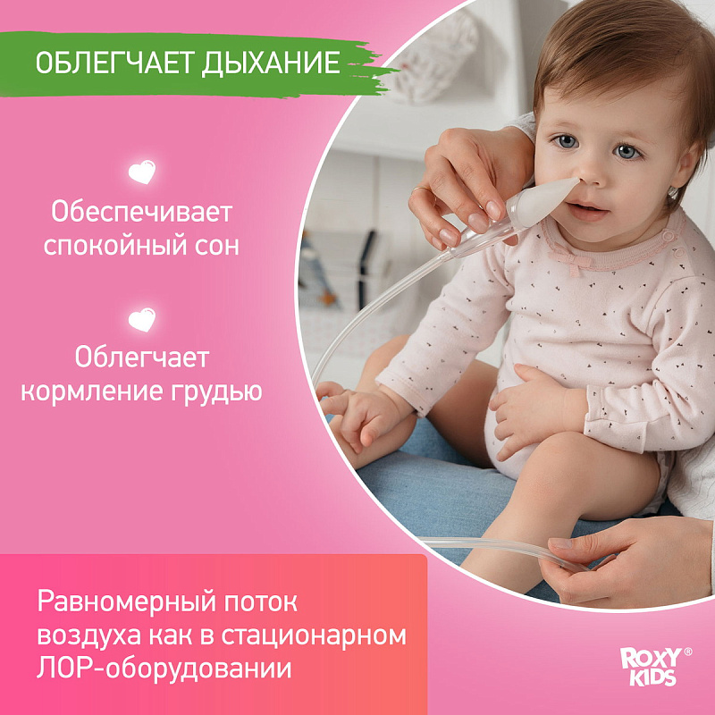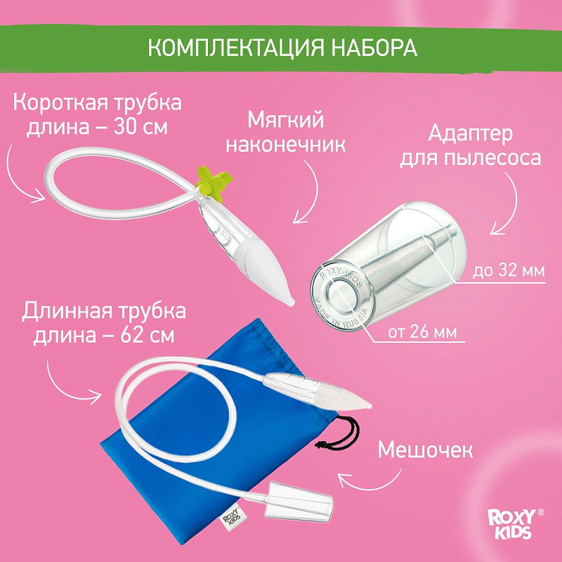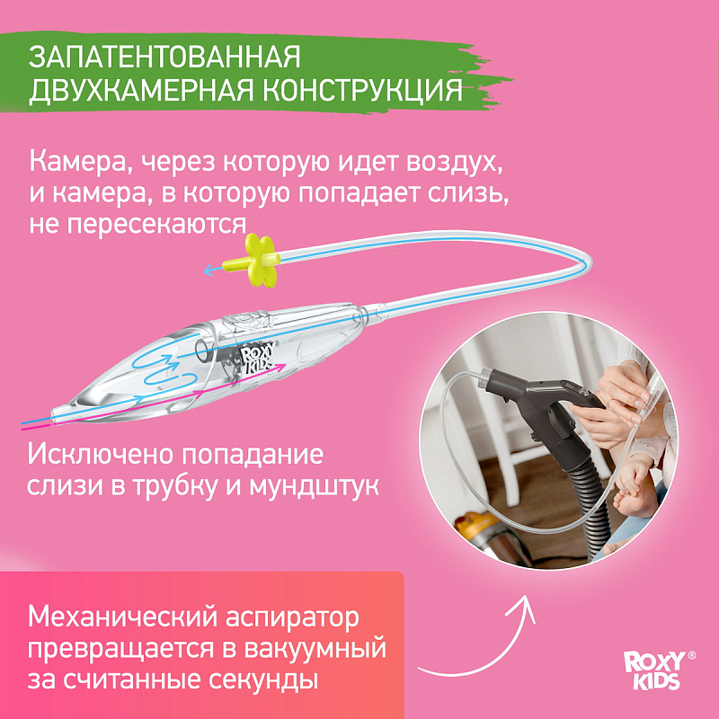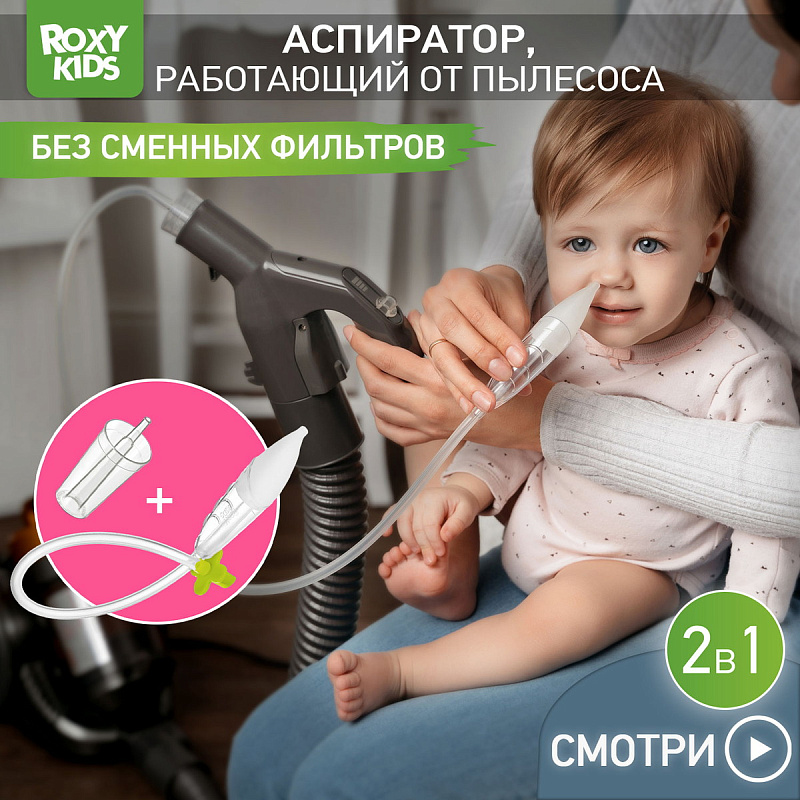 Аспиратор для новорожденных ROXY-KIDS c адаптером для пылесоса в комплекте может использоваться в двух вариантах: как обычный механический аспиратор, работающий от маминого дыхания, и как вакуумный аспиратор. Изделие предназначено для очищения дыхательных путей, удаления слизистых выделений у новорожденных, грудных детей и детей младшего дошкольного возраста (до 3 лет). Анатомический мягкий наконечник и прозрачный материал аспиратора позволяют эффективно и легко производить эту гигиеническую процедуру.