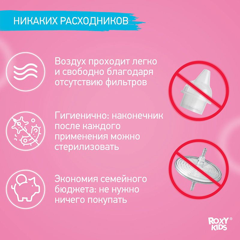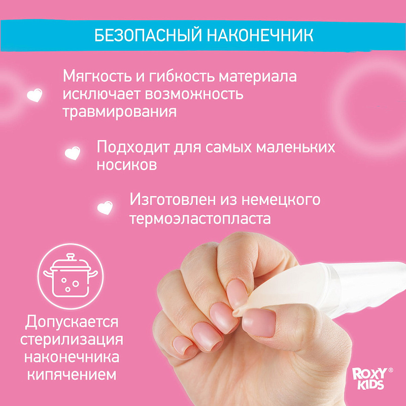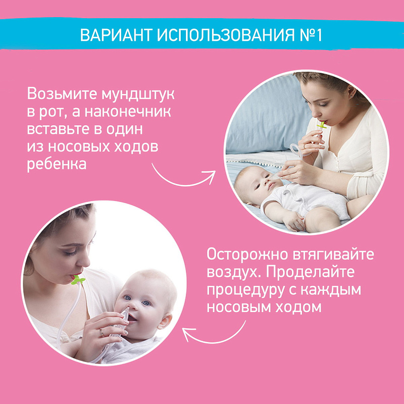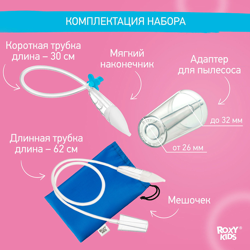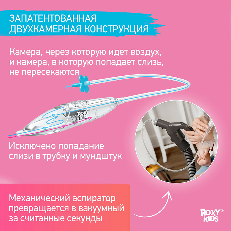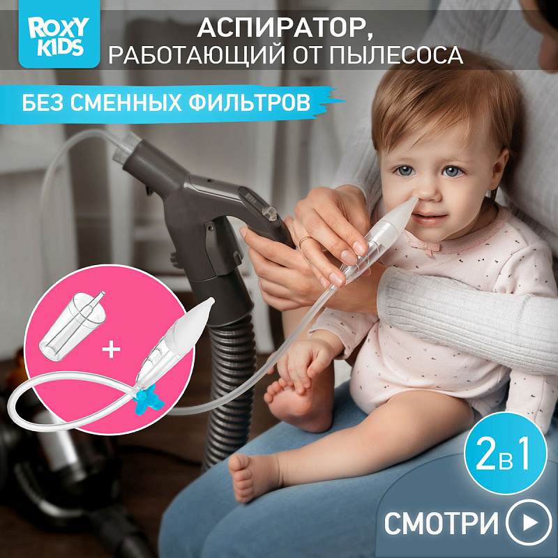 Аспиратор для новорожденных ROXY-KIDS c адаптером для пылесоса в комплекте может использоваться в двух вариантах: как обычный механический аспиратор, работающий от маминого дыхания, и как вакуумный аспиратор. Изделие предназначено для очищения дыхательных путей, удаления слизистых выделений у новорожденных, грудных детей и детей младшего дошкольного возраста (до 3 лет). Анатомический мягкий наконечник и прозрачный материал аспиратора позволяют эффективно и легко производить эту гигиеническую процедуру.