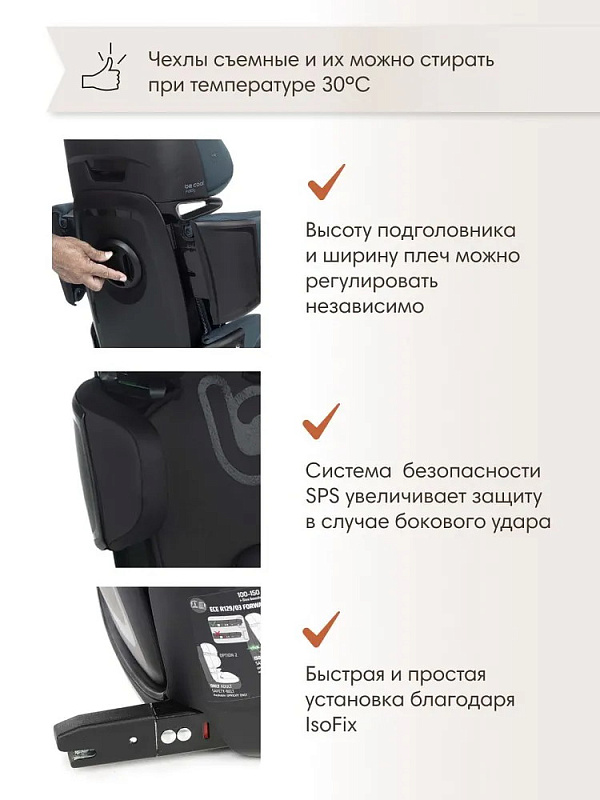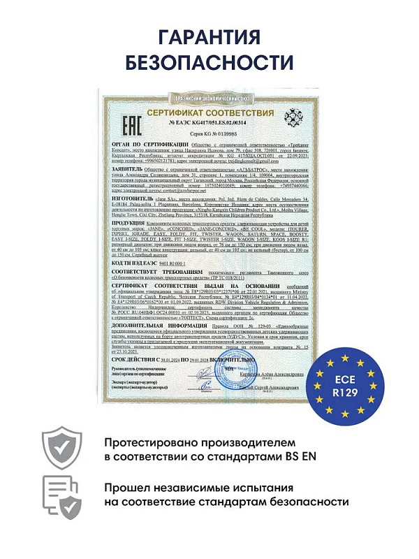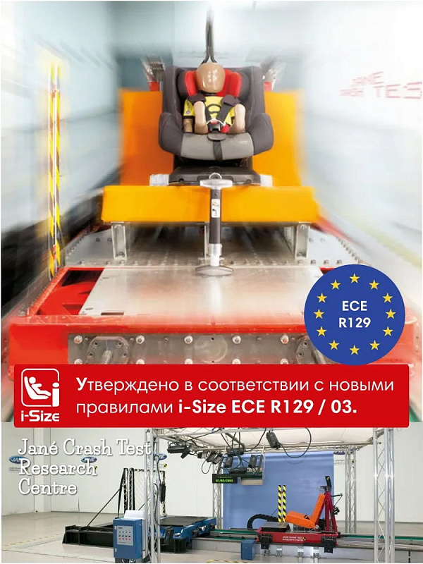 - Соответствует европейскому стандарту безопасности ECE R129 (i-Size);