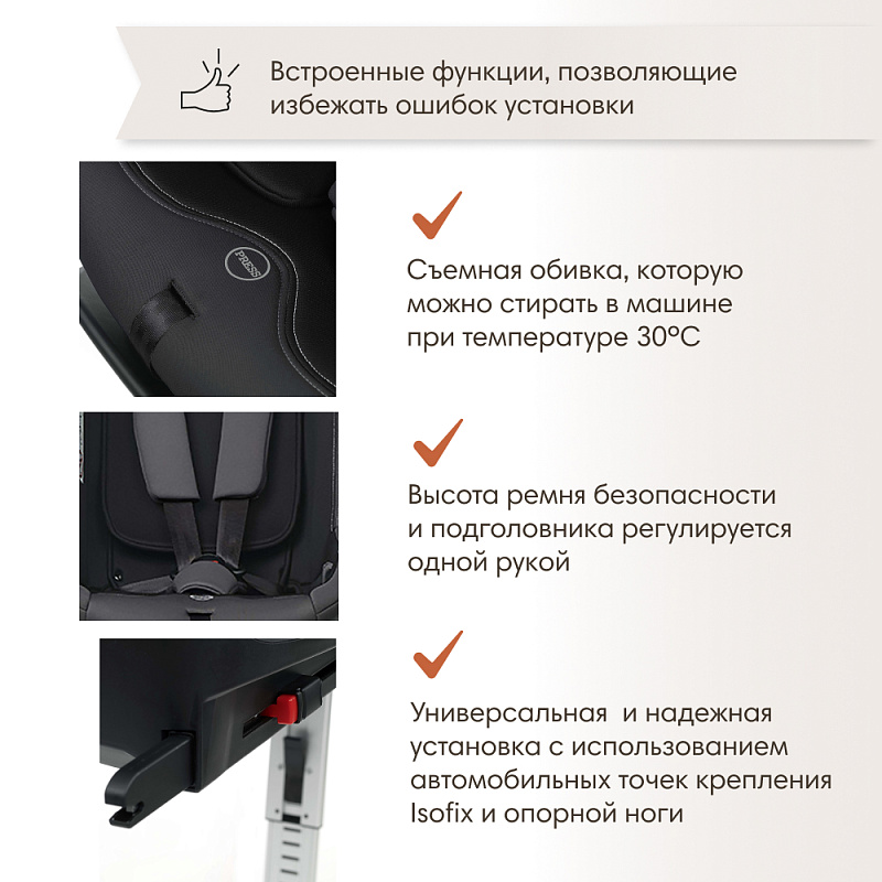 - Универсальная, простая, безопасная и надежная установка с использованием автомобильных точек крепления Isofix и опорной ноги;