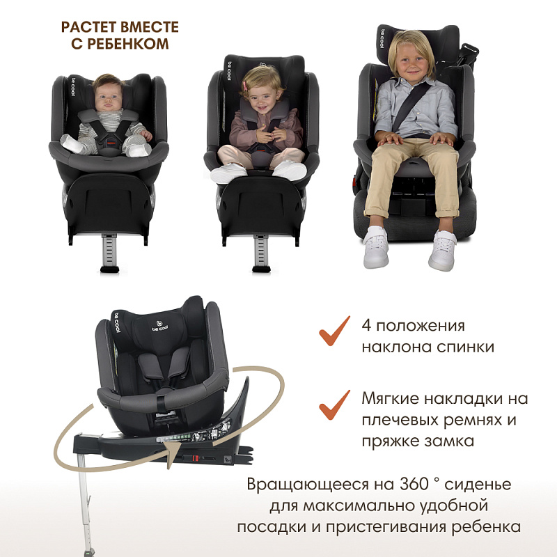 - Вращающееся на 360° сиденье позволяет родителям легко разместить ребенка в кресле и правильно отрегулировать ремни безопасности;
