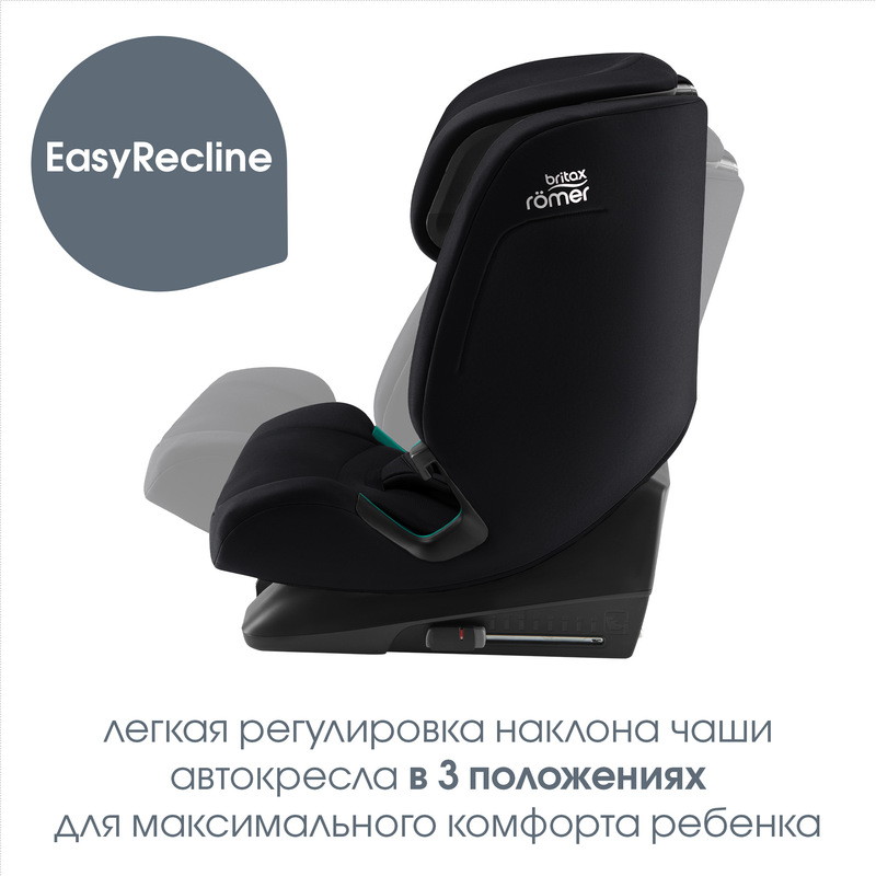 Система EasyRecline подходит для детей всех возрастов и позволяет отрегулировать положение наклона сиденья для большего комфорта. При этом нет необходимости регулировать якорный ремень, а ребенок может оставаться в кресле, что очень удобно.