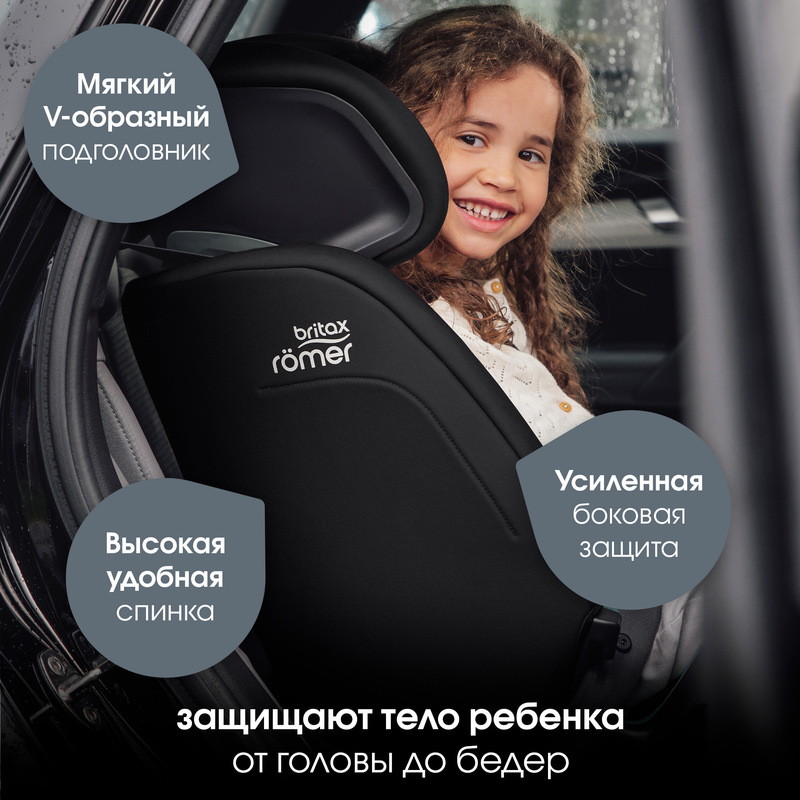 Наш специально разработанный V-образный подголовник обеспечивает оптимальную защиту при боковых столкновениях, ограничивая движение головы ребенка, и в то же время предоставляет максимальный комфорт. Кроме того, подголовник и ремень безопасности можно легко регулировать в соответствии с ростом ребенка.