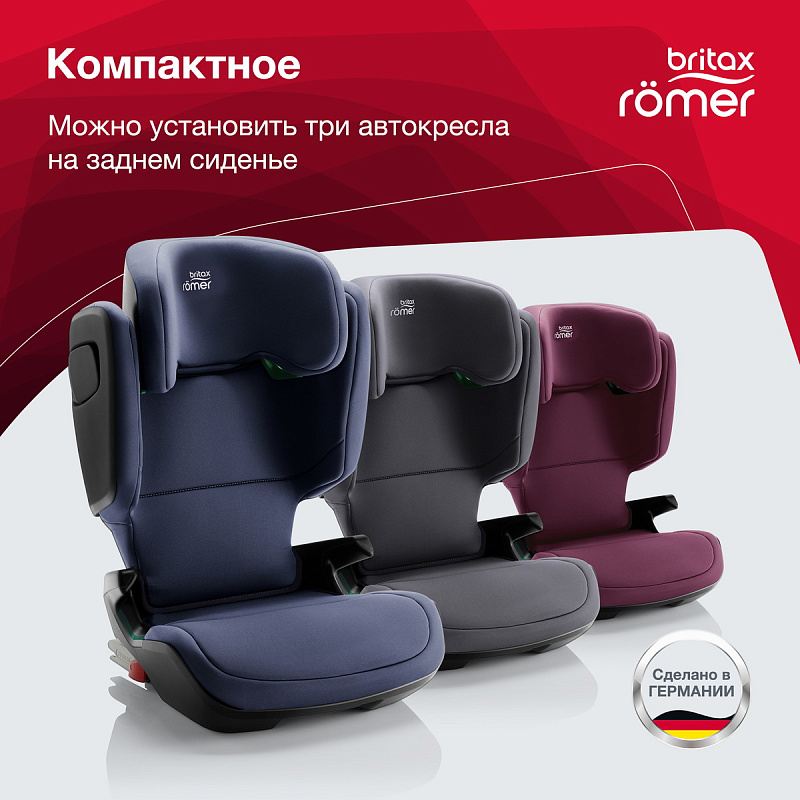Облегчённая компактная конструкция позволяет устанавливать три автокресла на заднем сидении самых разных автомобилей.