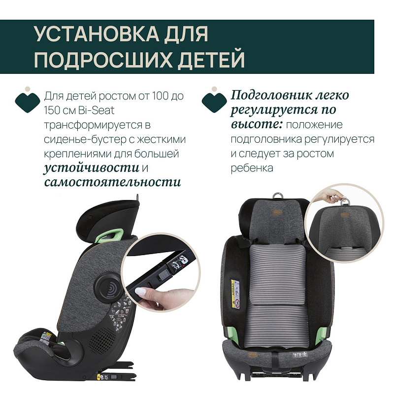 Универсально детское автокресло для всех возрастов Chicco Bi-Seat I-Size with Base Full 360 (Кикко Би-сит Айсайз с базой Фулл 360) представляет собой модульную конструкцию, включающую в себя полноценную отдельную базу изофикс Chicco Full 360 i-Size, которая может также использоваться с автолюлькой Chicco Kory, и устанавливаемую на нее чашу автокресла, которая имеет собственные встроенные крепления Isofix и в дальнейшем используется без платформы изофикс.