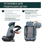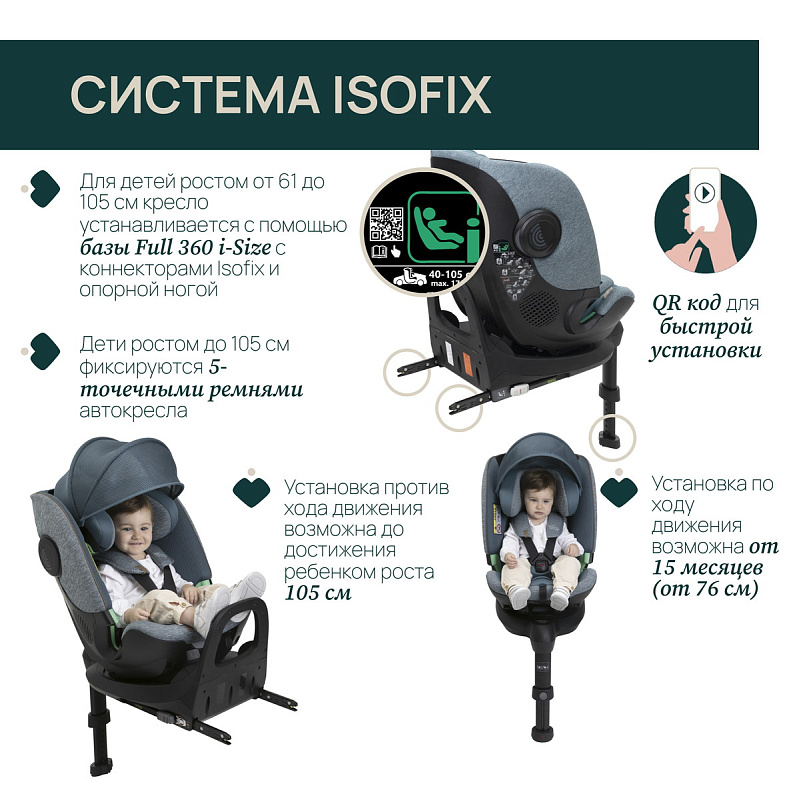 По мере роста младенца вынимается внутренний вкладыш, идущий в комплекте, а затем, когда ребенку станет тесно, но не ранее возраста 15 месяцев, автокресло можно использовать в положении по ходу движения. Когда рост ребенка превысит 105 см, внутренние ремни убираются в ниши в корпусе кресла, база ISOFIX демонтируется, а чаша кресла фиксируется с помощью встроенных креплений изофикс, а юный пассажир вместе с автокреслом удерживается штатными 3-точечными ремнями безопасности автомобиля.