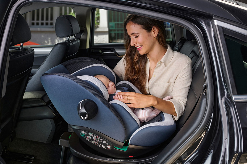 СИСТЕМА EASY-BOARDING: Поворот на 90° обеспечивает легкий доступ лицом к родителю для размещения ребенка, затем переключается в положение лицом назад или вперед.