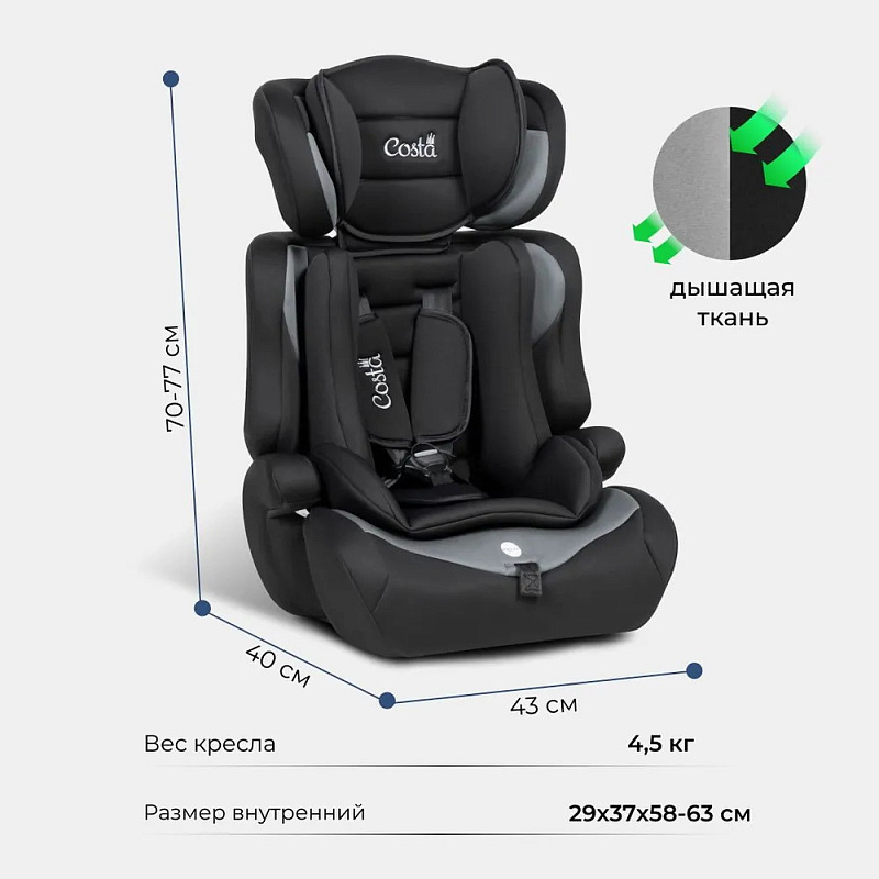 Детское автокресло Costa HC-01 - это удобное, безопасное и стильное кресло для детей возрастом от 1 до 12 лет весом от 9 до 36 килограмм.