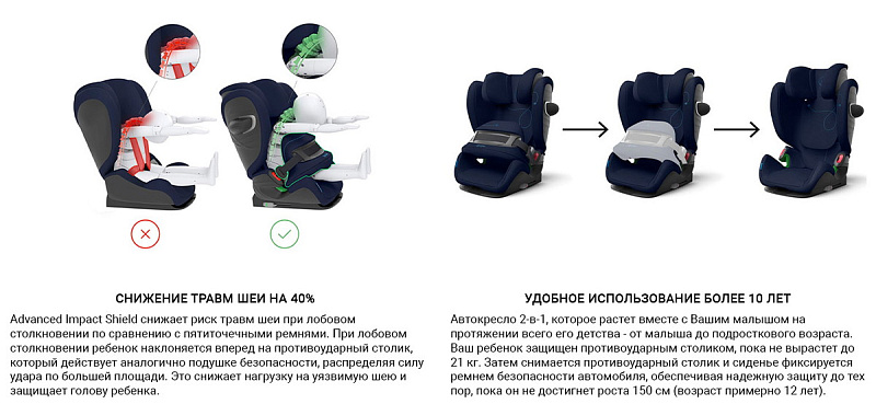 Сиденье 2-в-1, которое растет вместе с вашим малышом на протяжении всего его детства, от малыша до подростка. Ваш ребенок защищен противоударным щитком, пока он не весит 21 кг. Затем снимается противоударный щиток и сиденье фиксируется ремнем безопасности автомобиля, обеспечивая надежную защиту до тех пор, пока рост вашего ребенка не достигнет 150 см (около 12 лет).