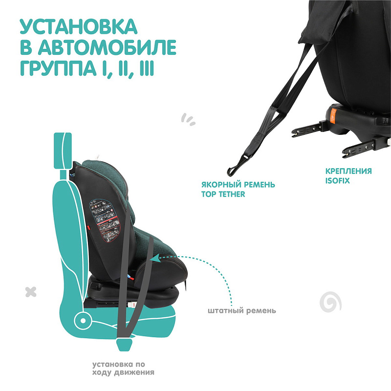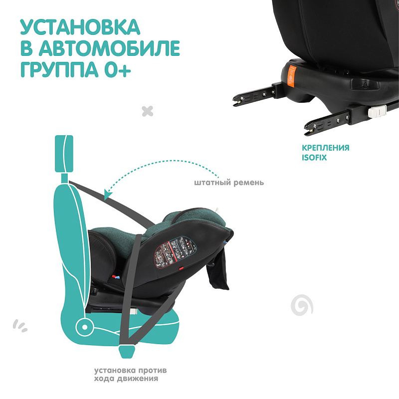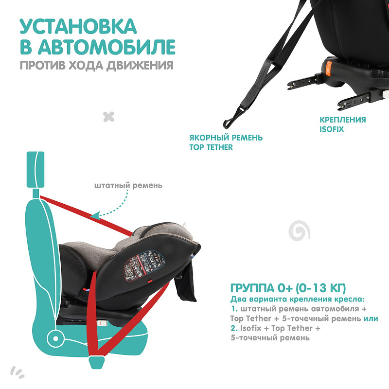 группа 0+ (установка против хода движения): Isofix + якорный ремень Top Tether, или штатный ремень;