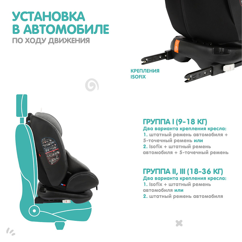 группа 1/2/3: Isofix + штатный ремень, или только штатный ремень;