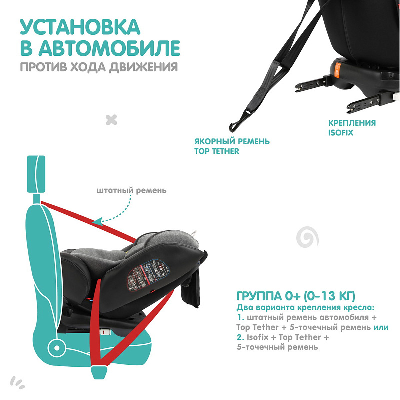 группа 0+ (установка против хода движения): Isofix + якорный ремень Top Tether, или штатный ремень;