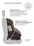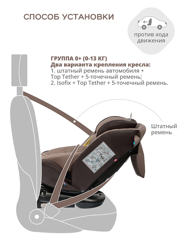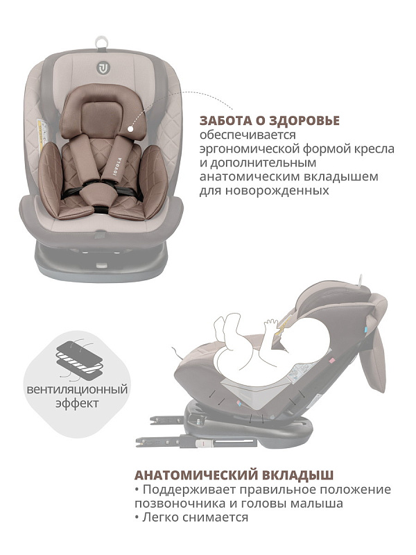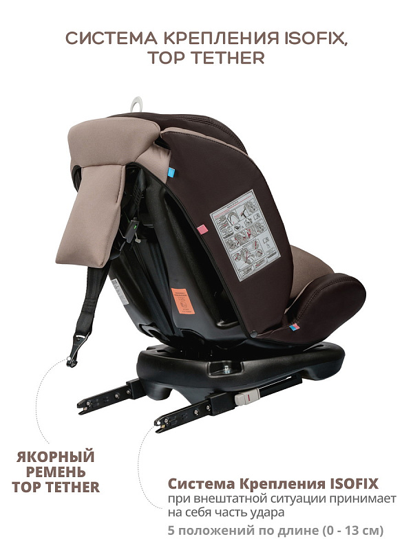 Стандарт безопасности ООН 44/04. Растущая модель. Включает в себя группы 0, 1, 2, 3 и выдерживает вес от 0 до 36 кг. Для новорожденных младенцев оно используется в качестве автолюльки, группа 0+, 0-13кг. Устанавливается против хода движения, крепится с помощью штатного ремня. При использовании в качестве авто люльки спинка опускается до положения лежа. А мягкий вкладыш матрасик с анатомической подушкой обеспечивает правильное и комфортное положение в дороге.