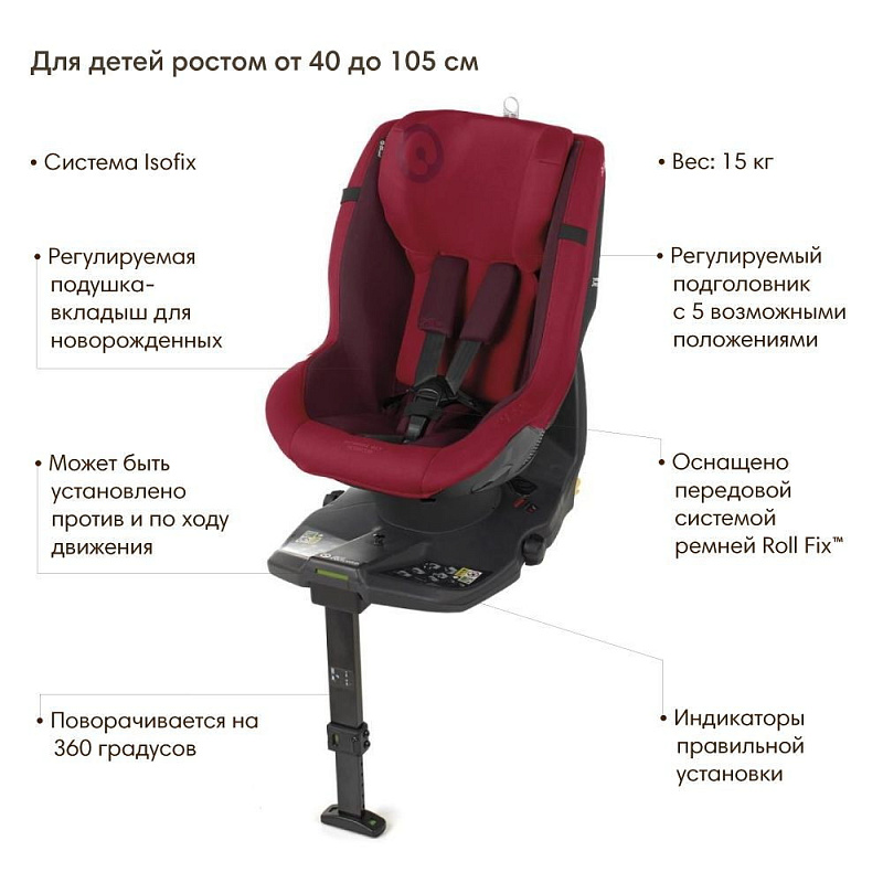 Автокресло соответствует европейским стандартам качества и безопасности. Оснащено функцией поворота на 360 градусов. Подголовник и спинка регулируются в нескольких положениях.