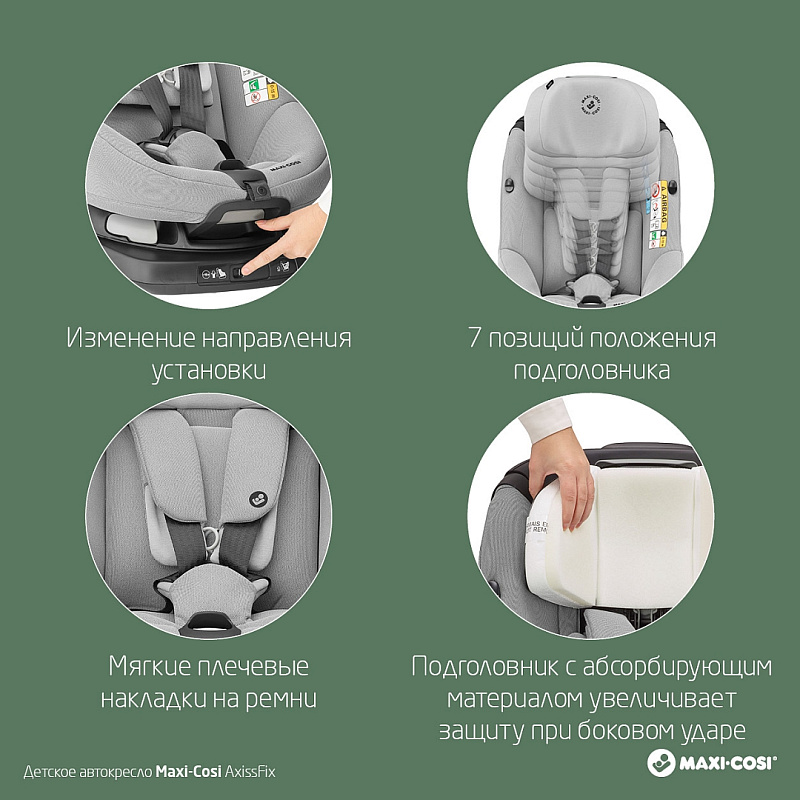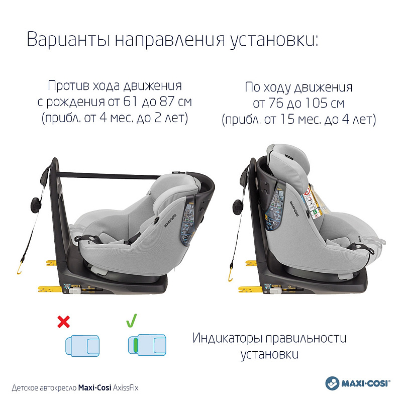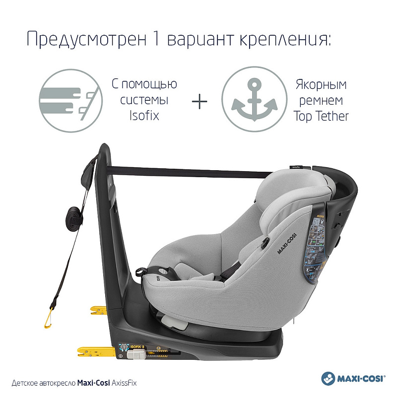 Дополнительную безопасность обеспечивают специальные штатные ремни, применяющиеся на базе Isofix. Maxi-Cosi AxissFix относится к реверсивному типу (есть возможность фиксации кресла, как по ходу, так и против хода движения).