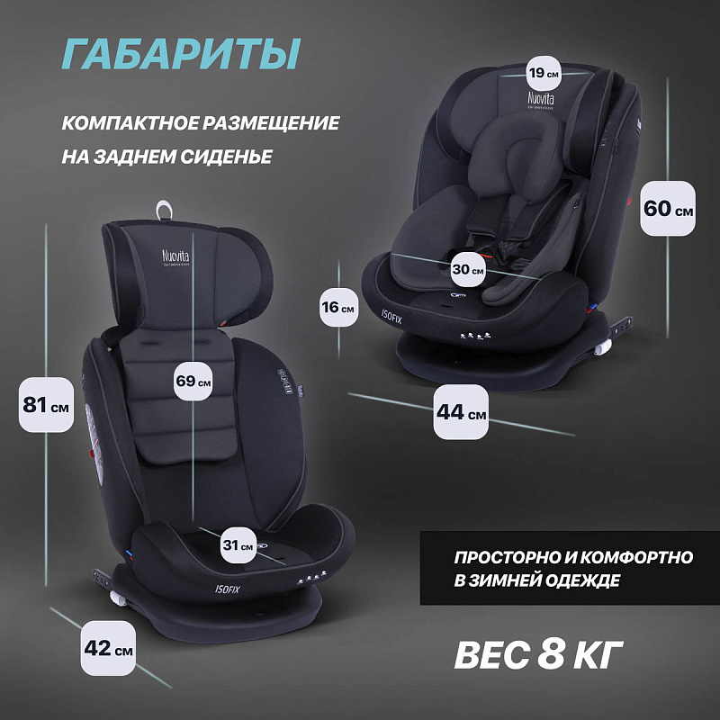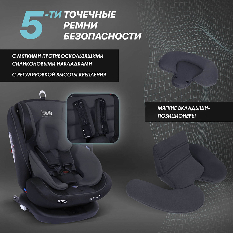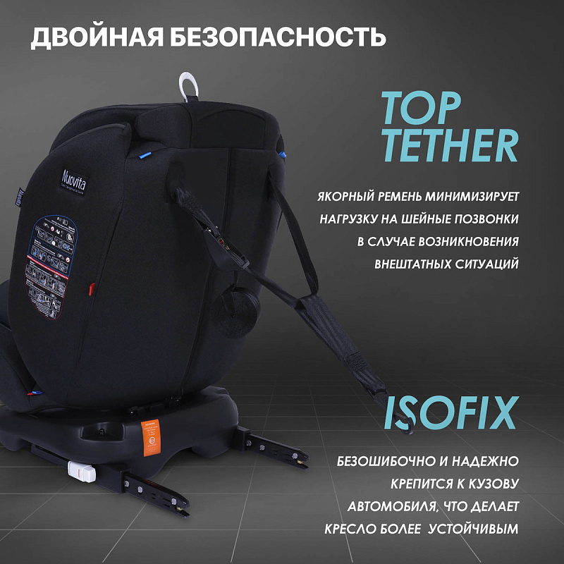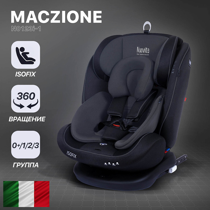 Безопасность, комфорт и универсальность — вот основные цели, которые преследовал бренд Nuovita при разработке автокресла Maczione N0123i-1. Данная задача реализована использованием целостной системы безопасности: системы крепления ISOFIX, штатных ремней и якорного ремня Top Tether, которые эффективно поглощают энергию нагрузки при внештатных ситуациях, минимизируя риск травмы головы и шеи ребенка.