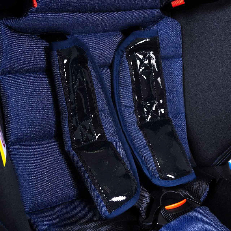 Мягкая тканевая обивка из меланжа с толстым слоем поролона и элементами из эко-кожи обеспечивает удобство малыша, а дополнительные вкладыши, накладки на ремни с дополнительным противоскользящим слоем, и подушка под голову с валиком-позиционером позволяют обеспечить ему безопасное и комфортное положение.
