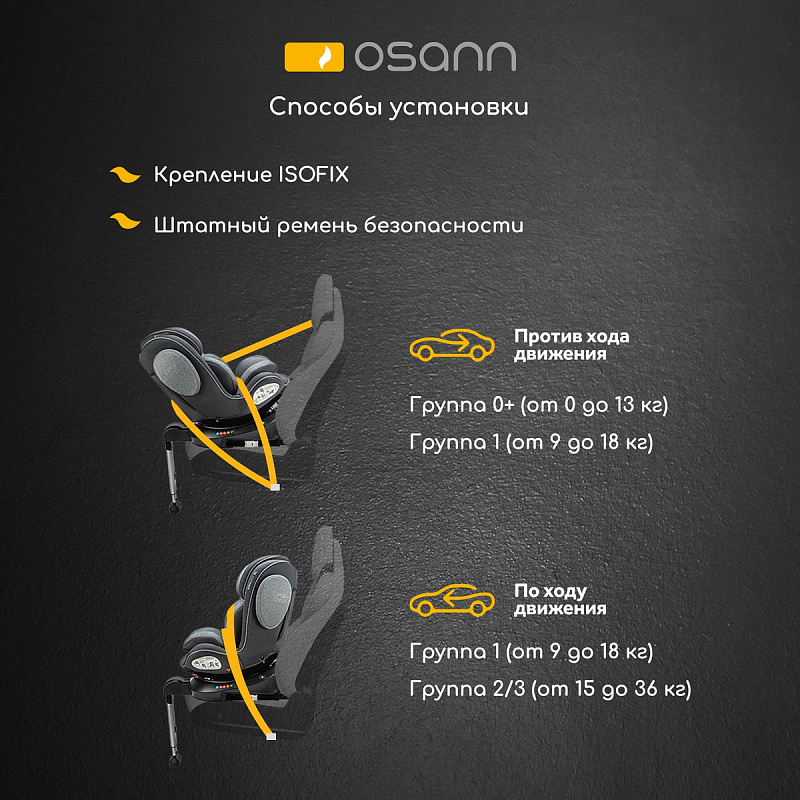 - для детей от 9 до 18 кг (группы 1) можно выбрать способ установки как против, так и по ходу движения автомобиля