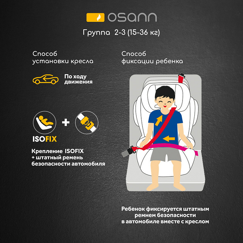 • Группа 2/3 (для детей от 15 до 36 кг): установка по ходу хода движения при помощи ISOFIX и штатного ремня автомобиля или только штатного ремня автомобиля, пристёгивание ребенка штатным ремнем автомобиля