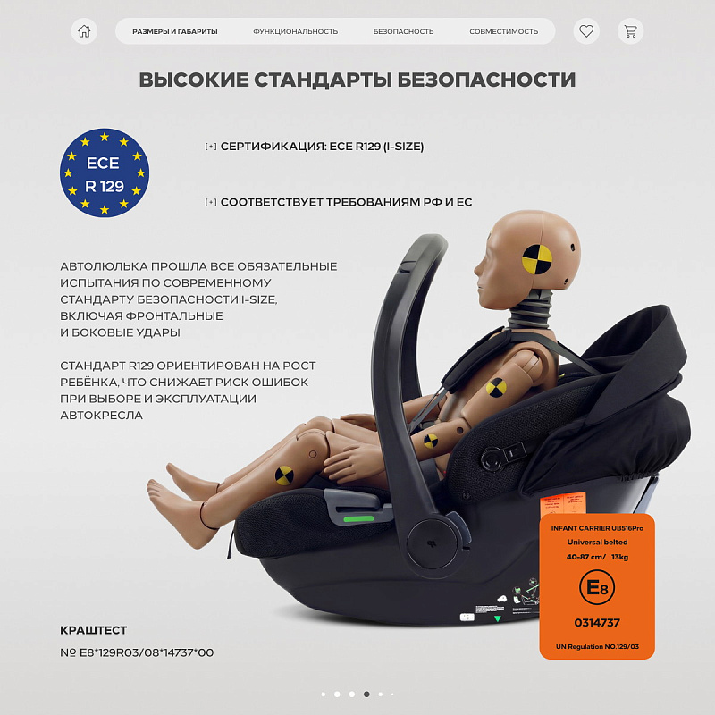 автокресло имеет новый международный Cертификат Eвропейского Cоюза (EAC) - ECE R129 (I-Size). Каждая модель перед запуском в линейке бренда RANT проходит ряд краш-тестов, имитирующих реальные дорожные ситуации.