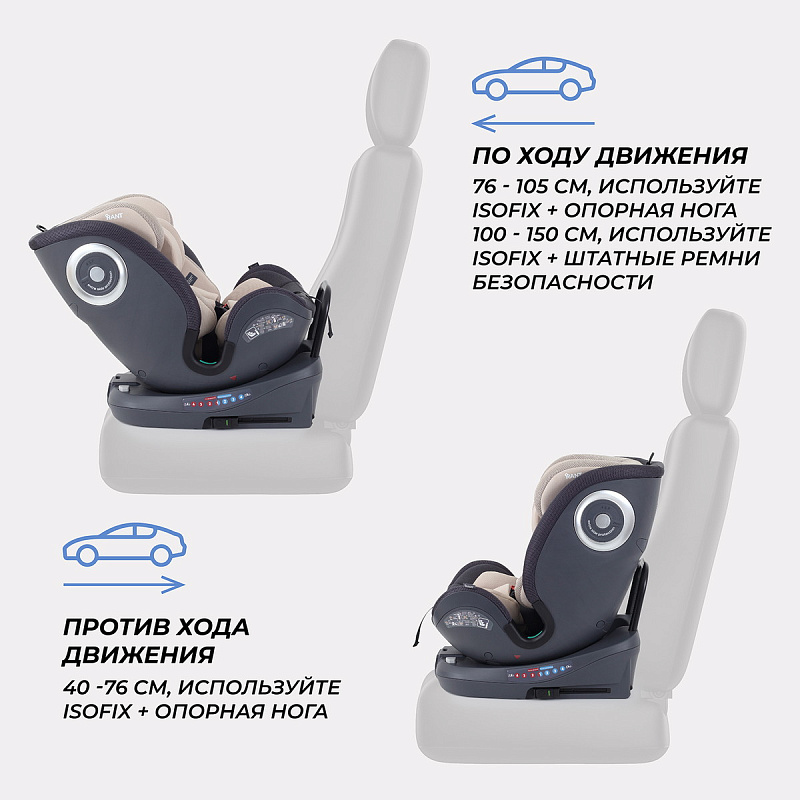 Дети ростом до 105 см фиксируются в кресле с помощью внутренних 5-точечных ремней с мягкими накладками предпочтительно в наиболее безопасном положении против хода движения, при этом автокресло крепится с помощью креплений ISOFIX и выдвижной опоры в пол. Для малышей старше 15 месяцев допустимо использование детского сиденья в положении по ходу движения.