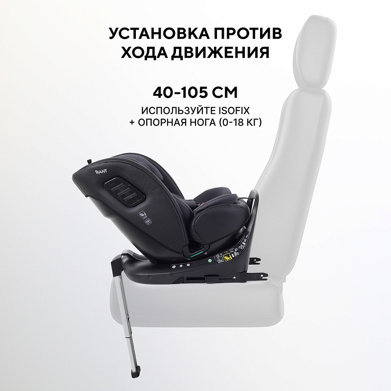 40–105 см (0-18 кг): против хода движения ISOFIX + опорная нога