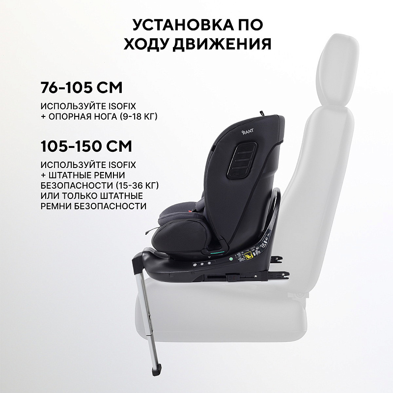 76–105 см (9-18 кг): по ходу движения ISOFIX + опорная нога