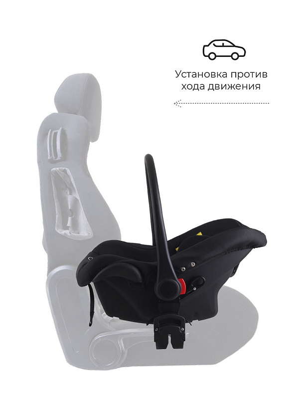 - крепится с помощью штатного ремня автомобиля против хода движения