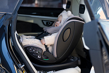 Мягкая эргономичная вставка удерживает ребенка в правильном положении, а усиленные плечевые накладки помогают ремням безопасности оставаться в нужном месте. Выдвижная основа с плавным вращением облегчает установку и извлечение ребенка, а также помогает защитить спину родителей.