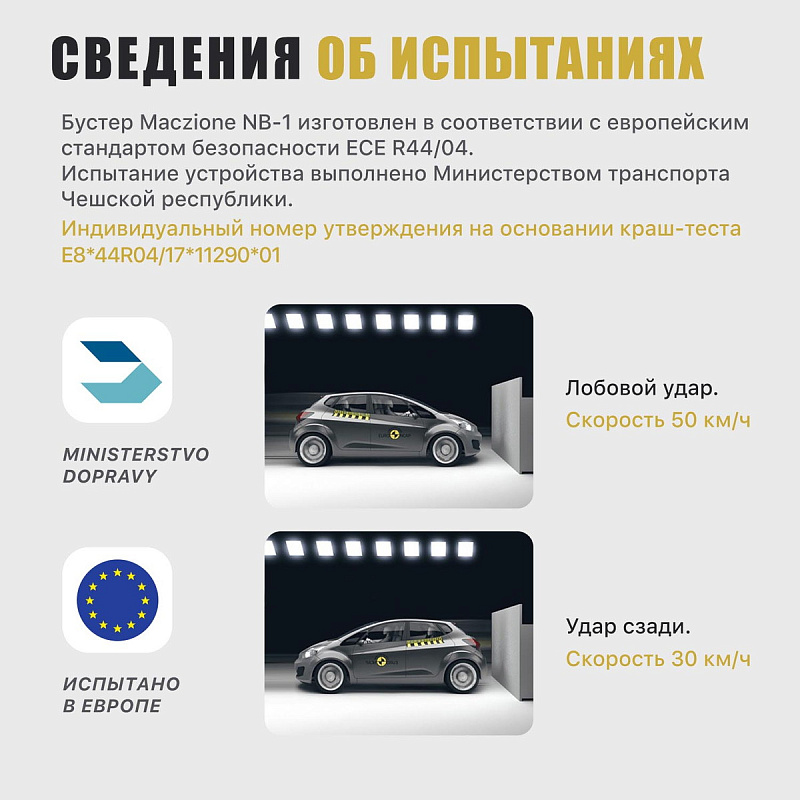 • Конструкция детского бустера Maczione NB-1 отвечает стандарту безопасности детских удерживающих устройств ECE R44/04, действующему на территории Евросоюза. Тестовые испытания были проведены Министерством транспорта Чешской республики (протокол утверждения № E8*44R04/17*11290*01.