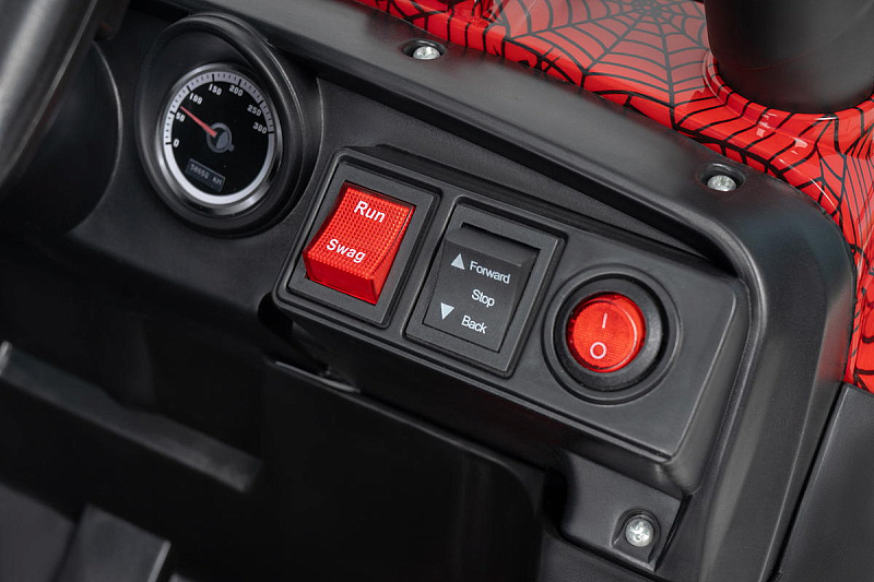 Машина работает от аккумулятора. Ребенок сам управляет электромобилем педалью газа и рулем. Также предусмотрен пульт дистанционного управления для родителей. Для безопасности есть поясной ремень безопасности. Широкая колесная база машины устойчива и надежна.