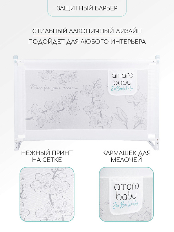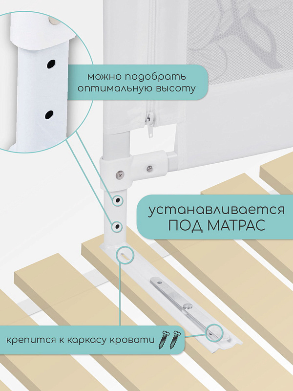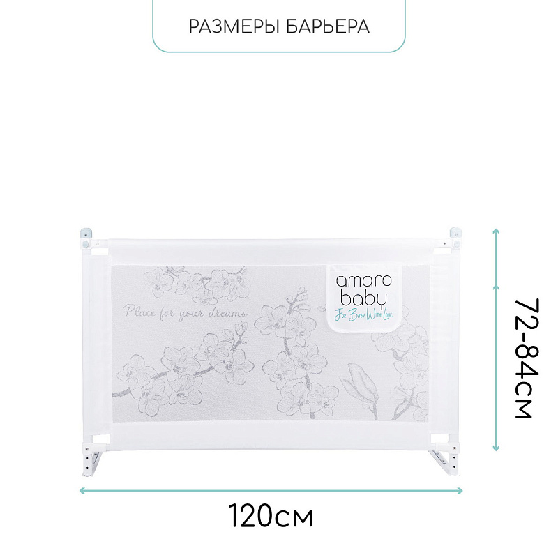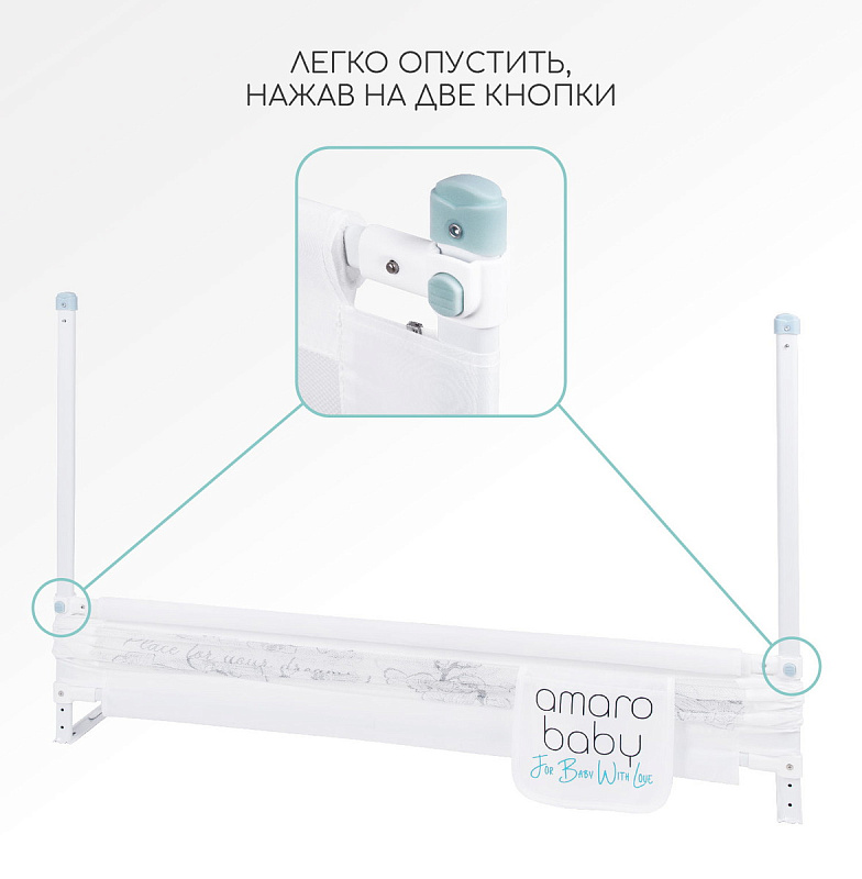Барьер защитный от AMAROBABY. Это защитное ограждение для безопасности малыша. Бортик позволяет предотвратить падение во время сна или бодрствования. Длина барьера 120 см (для удобства установки есть погрешность в меньшую сторону), высотой от 66 до 80 см. Устанавливается под матрас и крепится к каркасу кровати. При необходимости можно приобрести несколько бортиков и соединить их между собой, в комплектации идет соединительная крышка. Металлический каркас обеспечивает надежность и безопасность. Бортик удобен в эксплуатации за счет складного механизма, его легко опустить, нажав на две кнопки. При необходимости ограждение для детей можно разобрать и взять с собой. Ткань барьера представляет собой сетку, что позволяет ребенку свободно дышать. Барьер поставляется в разобранном виде и прост в установке.