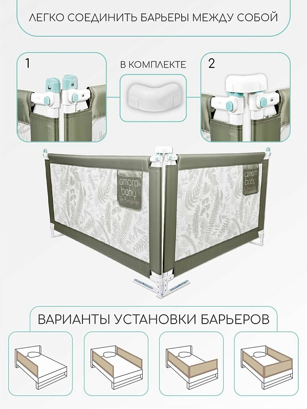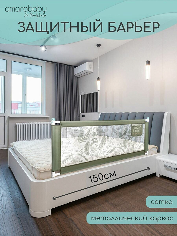 Барьер защитный от AMAROBABY. Это защитное ограждение для безопасности малыша. Бортик позволяет предотвратить падение во время сна или бодрствования. Длина барьера 150 см (для удобства установки есть погрешность в меньшую сторону), высотой от 66 до 80 см. Устанавливается под матрас и крепится к каркасу кровати. При необходимости можно приобрести несколько бортиков и соединить их между собой, в комплектации идет соединительная крышка. Металлический каркас обеспечивает надежность и безопасность. Бортик удобен в эксплуатации за счет складного механизма, его легко опустить, нажав на две кнопки. При необходимости ограждение для детей можно разобрать и взять с собой. Ткань барьера представляет собой сетку, что позволяет ребенку свободно дышать. Барьер поставляется в разобранном виде и прост в установке. Все необходимые детали есть в комплекте. Подходит для большинства моделей кровати.