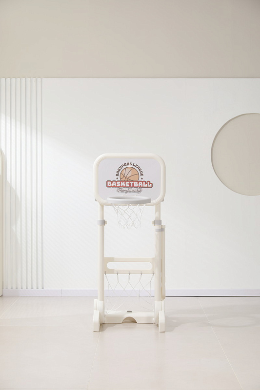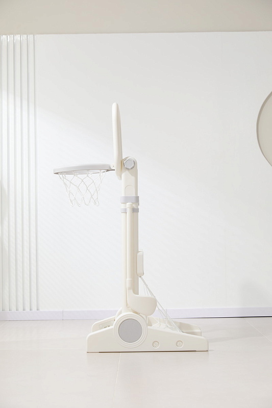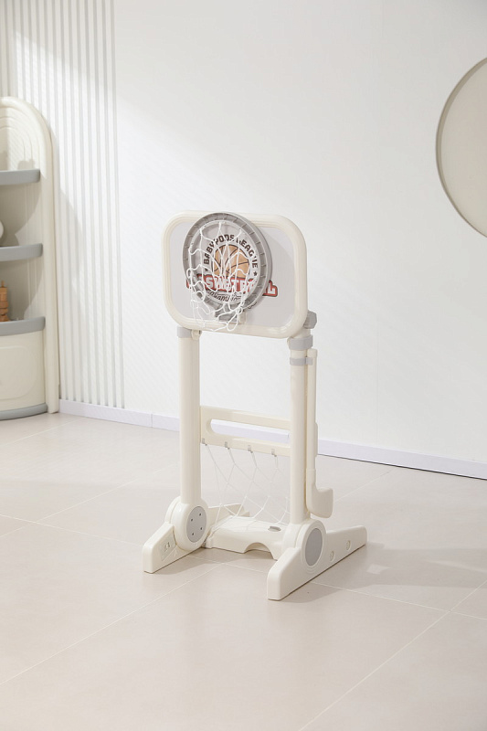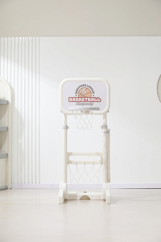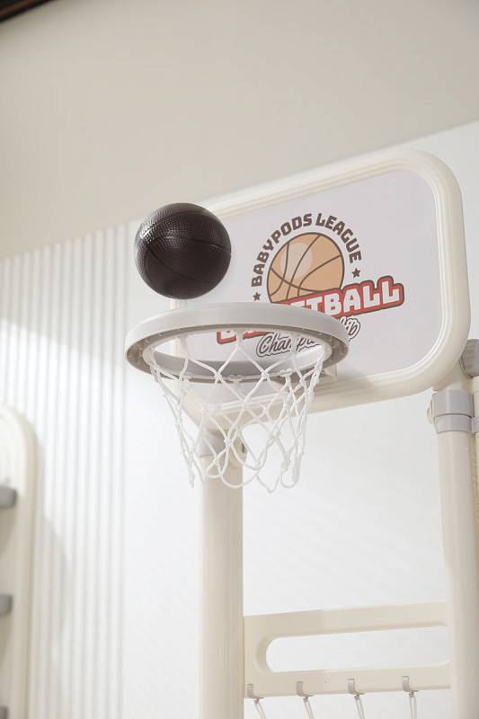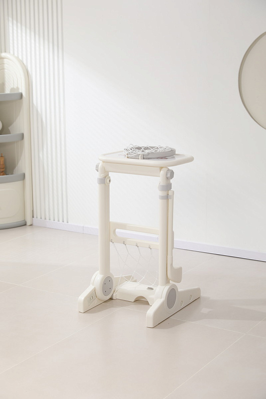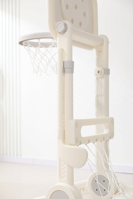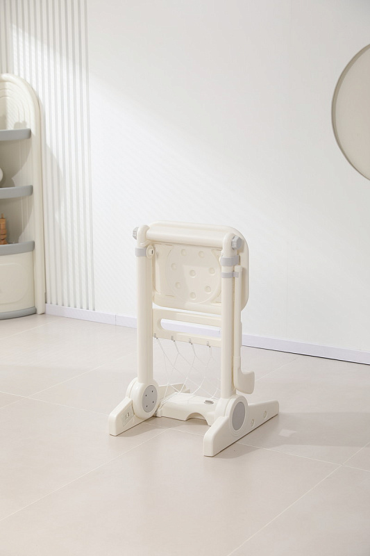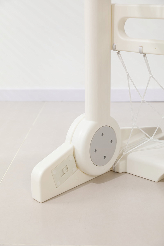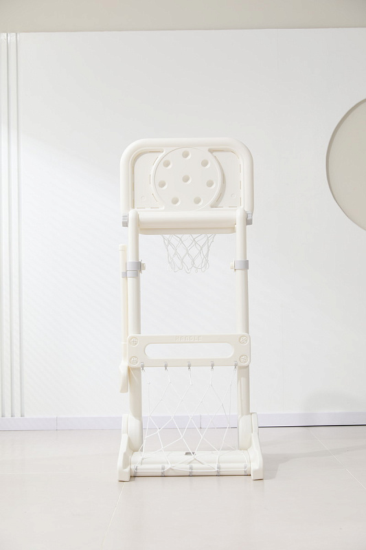 Игровая стойка выполнена из качественного пищевого пластика, отличающегося прочностью и долговечностью. Этот материал устойчив к воздействию влаги и солнечных лучей, что позволяет использовать комплекс как внутри помещения, так и на открытом воздухе. Компактная конструкция легко складывается, не занимая много пространства, что особенно актуально для небольших квартир и домов.
