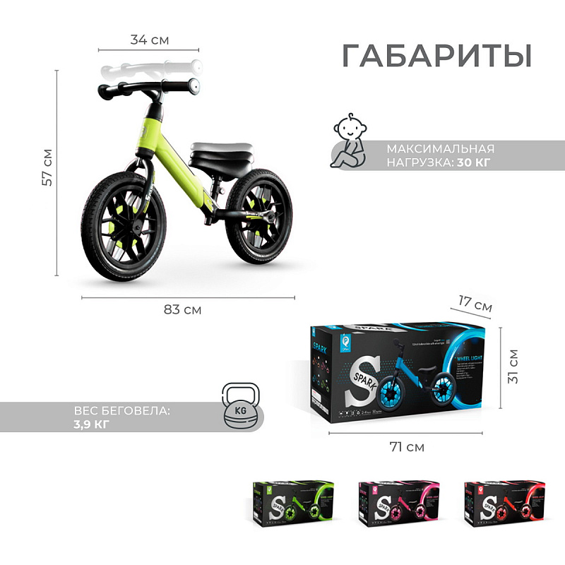 - Яркая LED подсветка на заднем и переднем колесах сделает катание более интересным, а ребенка более видимым в темное время суток (работает во время движения)