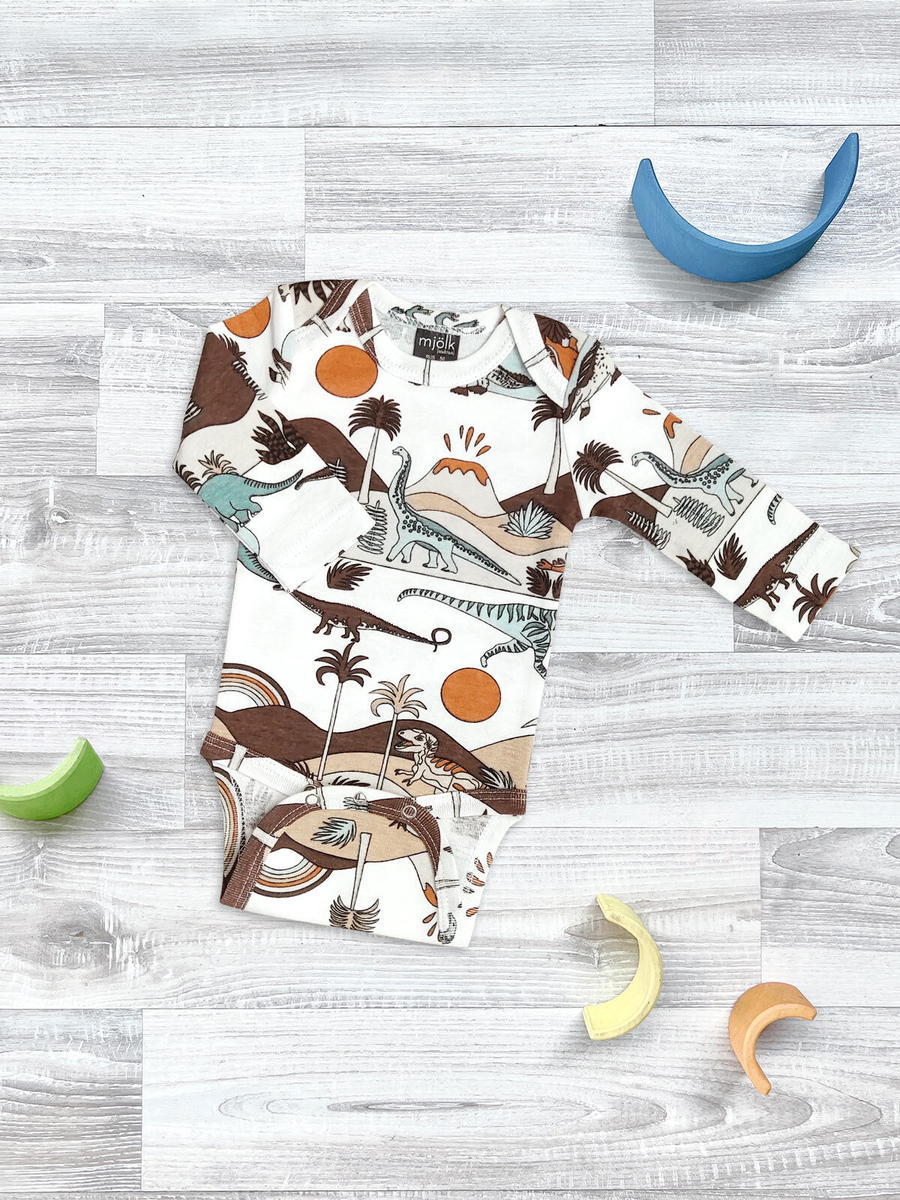 Боди Mjölk [мьёльк] Dinoworld с длинным рукавом выполнен из тонкого 100% трикотажного хлопка. Плетение нитей в этой ткани менее плотное, чем у другой одежды из нашей коллекции, что позволяет комфортно использовать боди в качестве первого слоя.