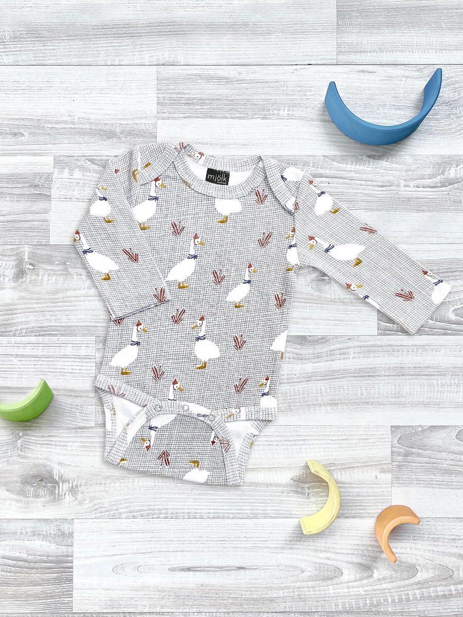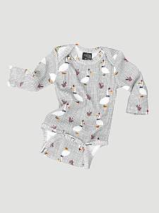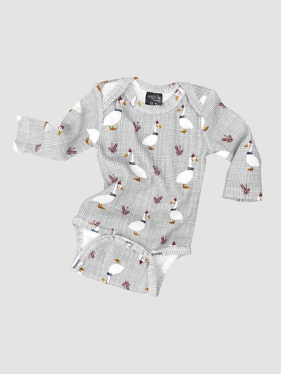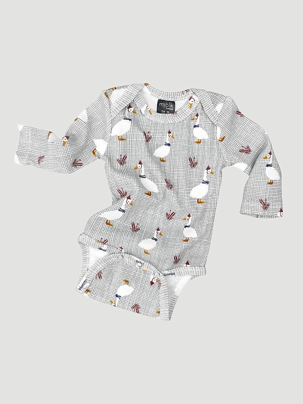 Боди Mjölk [мьёльк] Гуси с длинным рукавом выполнен из тонкого 100% трикотажного хлопка. Плетение нитей в этой ткани менее плотное, чем у другой одежды из нашей коллекции, что позволяет комфортно использовать боди в качестве первого слоя.