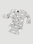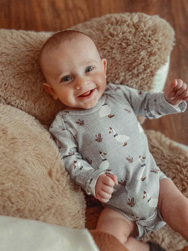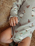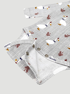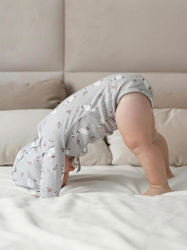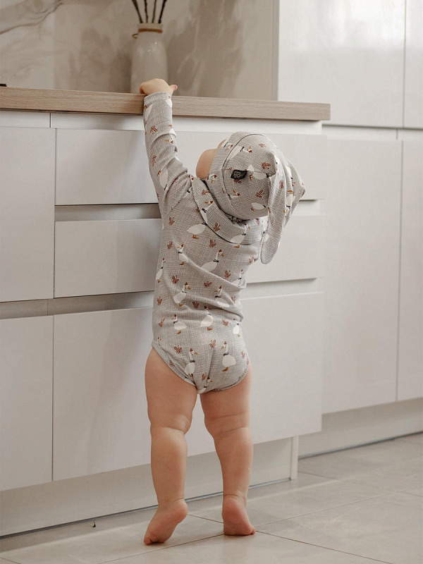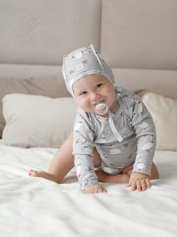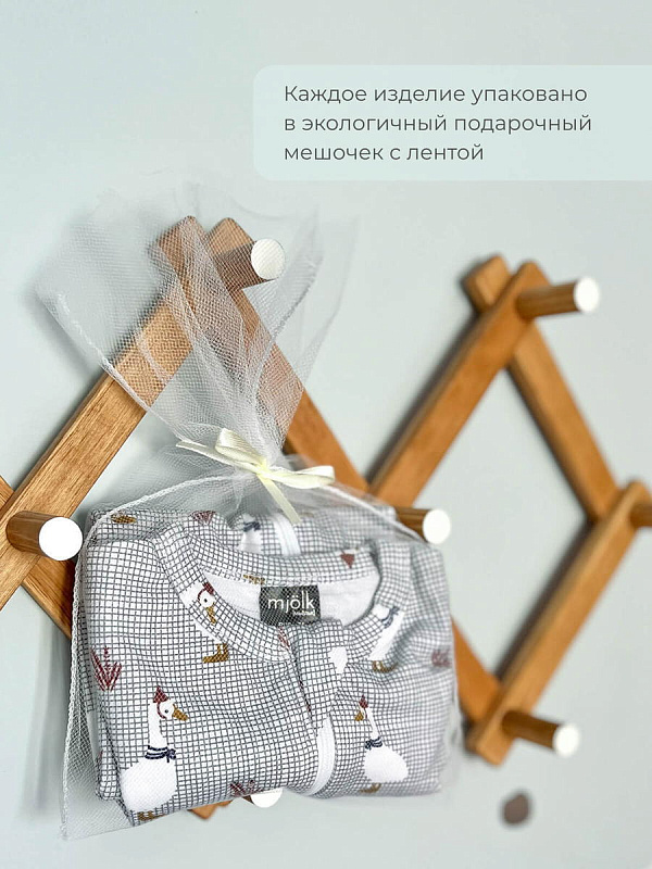 Боди Mjölk [мьёльк] растягивается по фигуре, ребёнку в нём не жарко, он не потеет. В такой одежде можно играть и спать круглый год, поддевать её под комбинезон или спальный мешок. Материал приятный на ощупь, эластичный, гигроскопичный, "дышит" и не вызывает аллергии. Кнопки расположены значительно выше их привычного месторасположения, что облегчает застёгивание изделия на малыше. В сопутствующих товарах можно подобрать изделия в комплект с таким же принтом: мягкую шапочку с узелком, двусторонний плед, сет пелёнок в тон или яркий комбинезон.